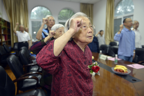 90华诞老同志周久华在会上发言。他表示,今天老同志们能欢聚一堂庆祝党的生日,是老一辈革命家用鲜血换来的,所以倍感珍惜。他列举了一组党员队伍不断发展壮大的数据,说明党员发挥模范作用的力量。他谈了自己1955年随青年代表大会代表团受到了毛泽东、朱德等党和国家领导人的接见,心情无比激动的经历,对自己30岁来到学校工作,60年来见证了学校的建设与发展表示欣慰。90华诞老同志周幼玲深情地谈到,自己当年毅然放弃燕京大学的学业参加了革命,是党的培养让自己从一名资产阶级的后代成长为了解放军战士。她还谈到,自己从解放前就递交了入党申请书,历经考验,离休后才终于如愿加入到党组织的怀抱。