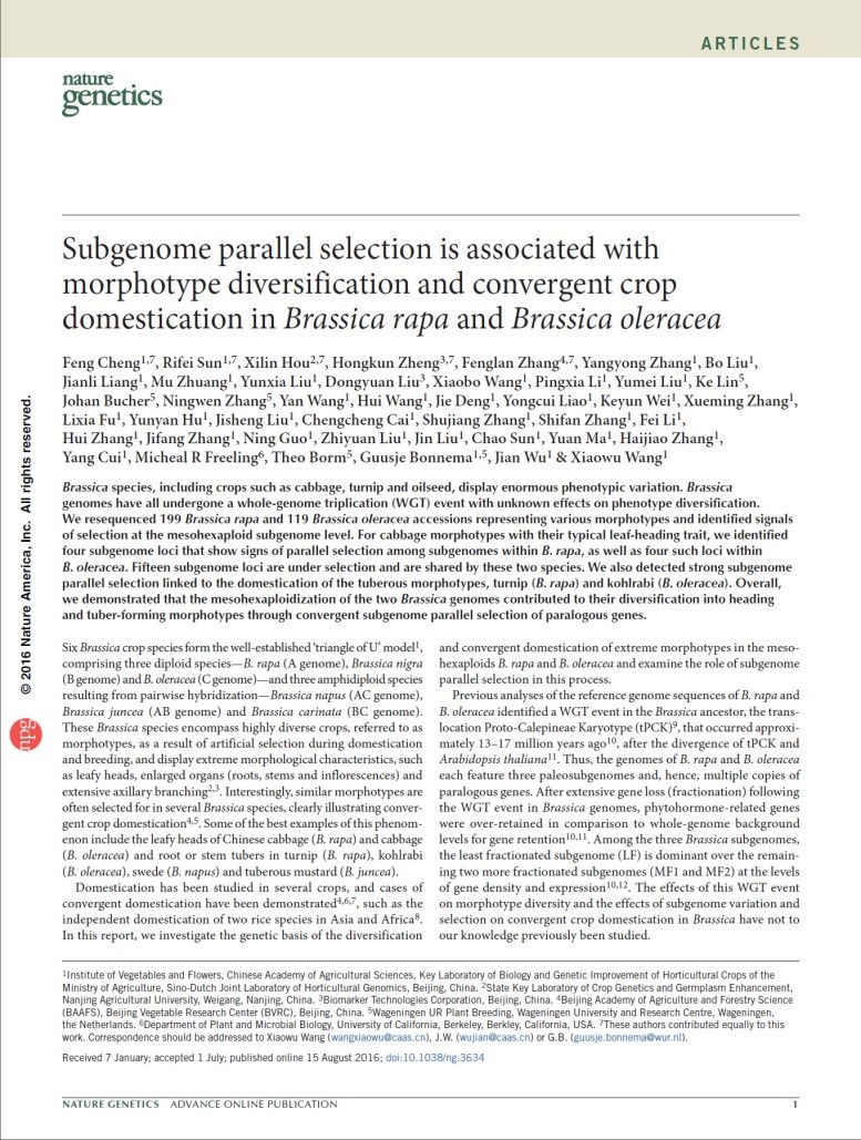 8月15日,《自然•遗传学(Nature Genetics)》杂志以Articles形式,在线发表了题为“Subgenome parallel selection is associated with morphotype diversification and convergent crop domestication in Brassica rapa and Brassica oleracea” (白菜和甘蓝类蔬菜中亚基因组的平行选择是导致物种驯化形成形态多样化的重要原因)的论文,研究揭示了亚基因组的存在促进了结球性状、根(茎)膨大等性状的驯化,进而形成器官形态的多样性;同源基因的平行选择是导致不同物种驯化形成类似产品器官的重要原因。这是我校白菜系统生物学实验室又一国际合作项目取得的重大突破,侯喜林教授为同等贡献第一作者(列第三位),ios版雷竞技官网作物遗传与种质创新国家重点实验室为第二完成单位。