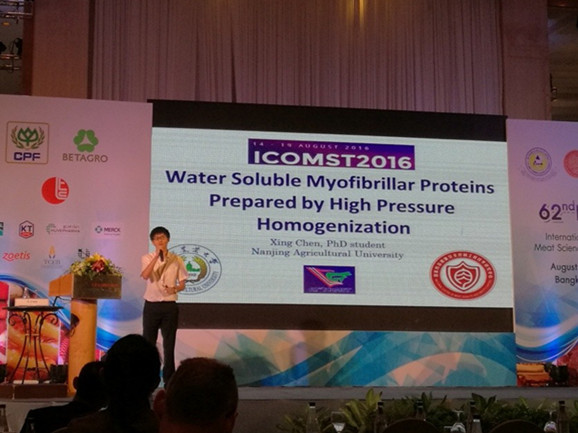 8月14-19日,我校国家肉品质量安全控制工程技术研究中心主任周光宏教授,徐幸莲教授等师生一行11人参加了在泰国曼谷举办的第62届国际肉类科技大会(International Congress of Meat Science & Technology, ICoMST),并在本次大会上作了学术报告,展出6幅张贴海报。我校博士生陈星所作学术报告“Water Soluble Myofibrillar Proteins Prepared by High Pressure Homogenization”引起与会代表广泛关注,并获得青年科学家优秀报告奖二等奖。这是中国科研院所与会代表在国际肉类科技大会上首次获奖。