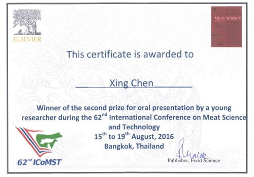 在本届大会上,国际肉类科技大会奖项首次由Elsevier 的《Meat Science》期刊颁发,共设青年科学家优秀报告奖一、二等奖各1名,优秀海报一、二等奖各1名。此奖项由国际肉类科技大会组委会预选,经《Meat Science》期刊编委会无记名打分评定,以表彰世界各国肉品科学领域年轻学者的优秀研究成果。