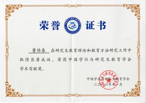 我校副校长董维春凭借其多年来在研究生教育理论和教育方法研究工作中开拓创新、做出的突出贡献,被授予第一届中国学位与研究生教育学会学术贡献奖。据悉,全国获得该项奖励的专家学者共5人。
