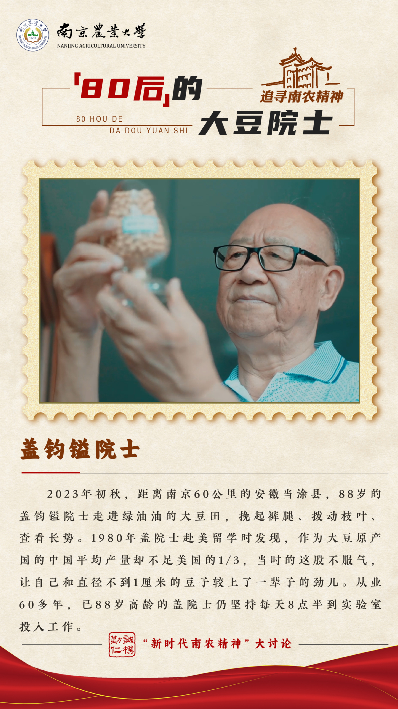 初秋,距离南京60公里的安徽当涂县,87岁的盖钧镒院士走进绿油油的大豆田,挽起裤腿、拨动枝叶、查看长势。1980年盖院士赴美留学时发现,作为大豆原产国的中国平均产量却不足美国的1/3,当时的这股不服气,让自己和直径不到1厘米的豆子较上了一辈子的劲儿。从业60多年,已87岁高龄的盖院士仍坚持每天8点半到实验室投入工作。