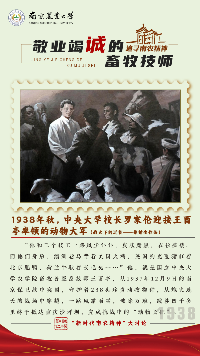 “他和三个技工一路风尘仆仆,皮肤黝黑,衣衫褴褛。而他们身后,澳洲老马背着美国火鸡,英国约克夏猪扛着北京肥鸭,荷兰牛驮着长毛兔……”他,就是国立中央大学农学院畜牧兽医系技师王酉亭,从1937年12月9日的南京保卫战中突围,守护着238头珍贵动物,从炮火连天的战场中穿越,一路风霜雨雪,破除万难,跋涉四千多里终于抵达重庆沙坪坝,完成抗战中的“动物长征”。
