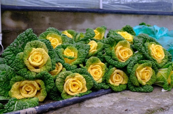 为何“黄玫瑰”的颜色呈现黄色?侯喜林表示,一方面是由于VC含量高,100克鲜重的“黄玫瑰”VC含量达到156毫克,是普通白菜的三倍多。但最重要的原因是类黄酮含量的提高,“黄玫瑰”突出特点是耐寒,可耐零下9.6摄氏度低温。由于温度降低,类黄酮含量提高,叶绿素和类黄酮比例发生变化,叶片会由绿转黄,且温度越低,叶片越黄,观赏性也越好。