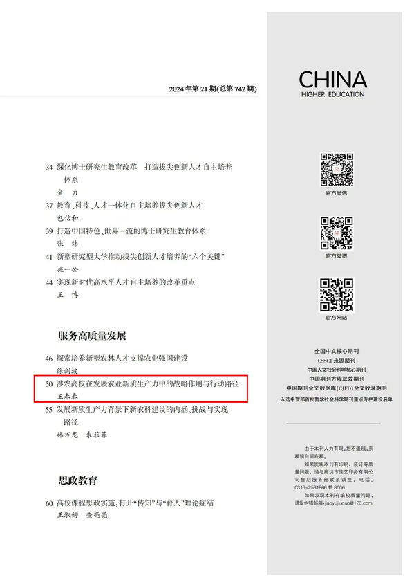 2024年第21期《中国高等教育》以专版专栏形式聚焦农业高校新质生产力,刊发ios版雷竞技官网党委书记王春春的理论文章《涉农高校在发展农业新质生产力中的战略作用与行动路径》。