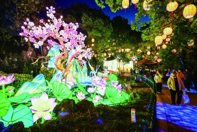 12月1日,白鹭洲公园内流光溢彩,大型灯组或庄严或磅礴,树林间装饰的氛围灯带散如星、聚如萤,为市民游客呈现一场华彩盛宴。 南京日报/紫金山新闻记者 董家训 摄