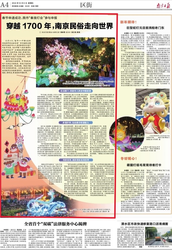 “春节是最有温度的节日,列入‘人类非遗代表作’可谓实至名归。”秦淮·非遗馆馆长尹磊告诉记者,去年,文化和旅游部首届“全国灯会灯彩项目展”选择非遗馆作为主场,成为春节期间最具吸引力的活动之一。今年春节,非遗馆将更好地讲述南京民俗故事,推出大量与春节年风年俗相关的非遗体验活动,利用虚拟现实等数字技术,生动展示中国非遗的生命力和无穷魅力。