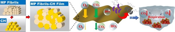 为了进一步地探明可食用生物塑料膜的结构-功能关系机制,课题组筛选出纤维化自组装能力显著地低于绿豆蛋白的豌豆蛋白。绿豆蛋白纤维呈现出典型的多形性:长线状与短小蠕虫状纤维共存;然而,豌豆蛋白纤维主要呈现长线状。更加重要的是,在其他条件相同的情况下,绿豆蛋白纤维-壳聚糖复合膜的CO2/O2透过选择性系数和机械性能均极显著地高于豌豆蛋白纤维-壳聚糖复合膜;相应地,应用绿豆蛋白纤维-壳聚糖复合膜包装水果,自发形成的密闭空间环境中的CO2含量更高,O2含量更低,水果贮藏后的可食率更高,营养品质提增能力更强。由此发现,豆类蛋白的纤维化能力越强,所形成的复合可食用生物塑料膜的性能及其被动气调包装保鲜水果功能越强。