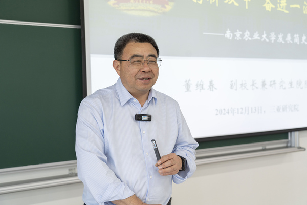 董维春一行首先看望慰问了海南专项研究生,并为同学们作了《躬耕双甲 奋进一流-ios版雷竞技官网发展简史》专题讲座。董维春通过对南农历史沿革的追溯和南农精神的解读,从中国与世界近现代高等农业发展史的讲解,再到现代大学农业教育体系的分析,让同学们了解了南农躬耕双甲的历程和奋进一流的目标,深刻体会到作为南农人的自豪感。董维春希望同学们脚踏实地、苦练本领,以时不我待、勇往直前的闯劲和韧劲,勇担强农兴农使命。讲座结束后,董维春、林江辉与同学们进行了座谈交流,解答了同学们在琼学习与学校衔接交流方面遇到的问题。