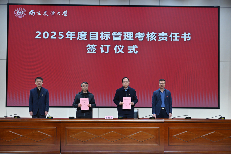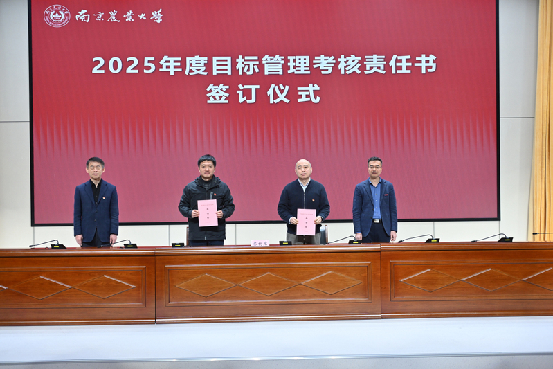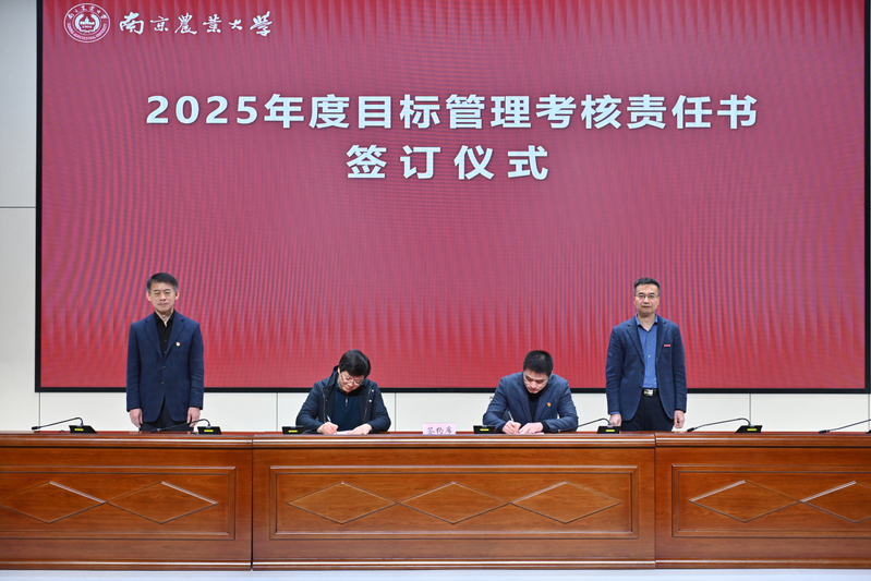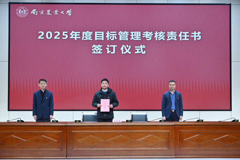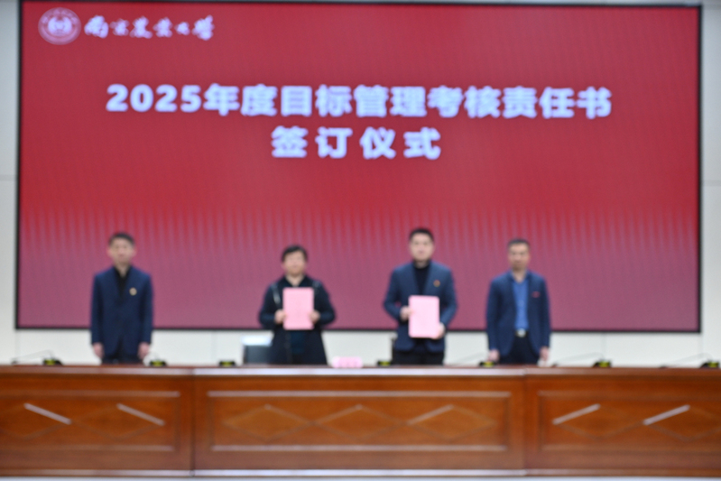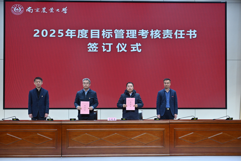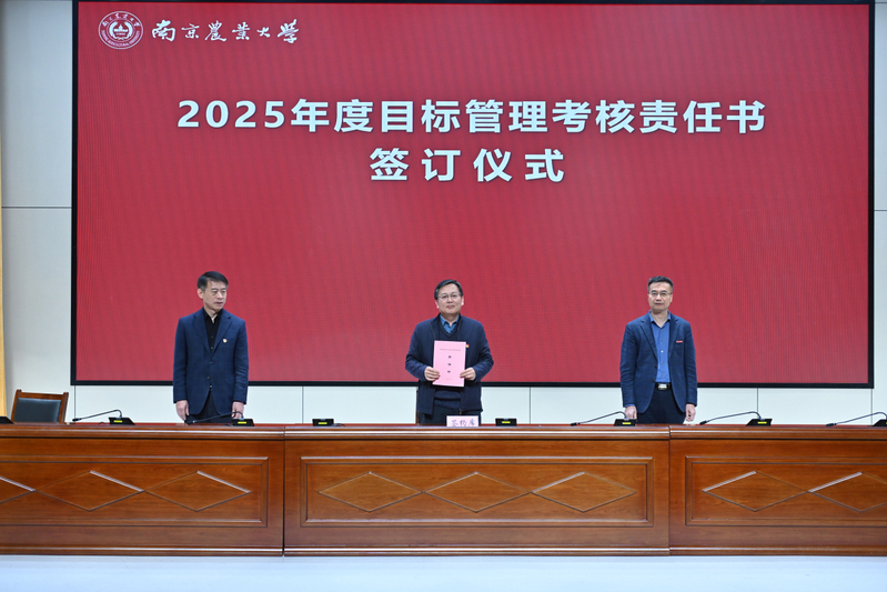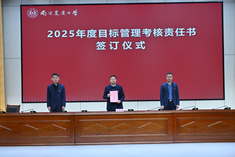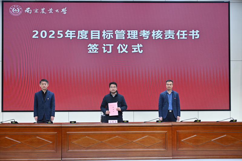 会上举行了2025年度全校目标管理考核责任书签订仪式,全体校领导、各学院各单位主要领导依次签订责任书。