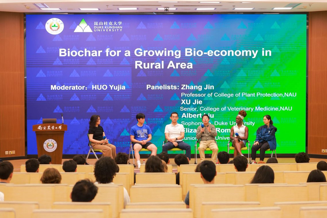 在圆桌讨论环节,来自我校的四位专家和两位本科生,与美国杜克大学的两位本科生分别就如何应用生物炭技术改善全球气候问题以及如何在同一健康领域开展国际合作发表了各自的见解,并与台下的中外学生开展了热烈地交流讨论。ios版雷竞技官网前沿交叉学院佟昊副教授表示,One Health的研究涉及人类、动物和环境三者之间的相互关系,这对我们解决全球性的健康问题具有重要意义。ios版雷竞技官网植物保护学院张进教授指出,生物炭在全球农业和环境领域有广泛应用,比如土壤改良、污染修复等。在病虫害防治中,生物炭可通过改变害虫栖息环境或食物资源降低其繁殖率,具有非常重要的研究价值。