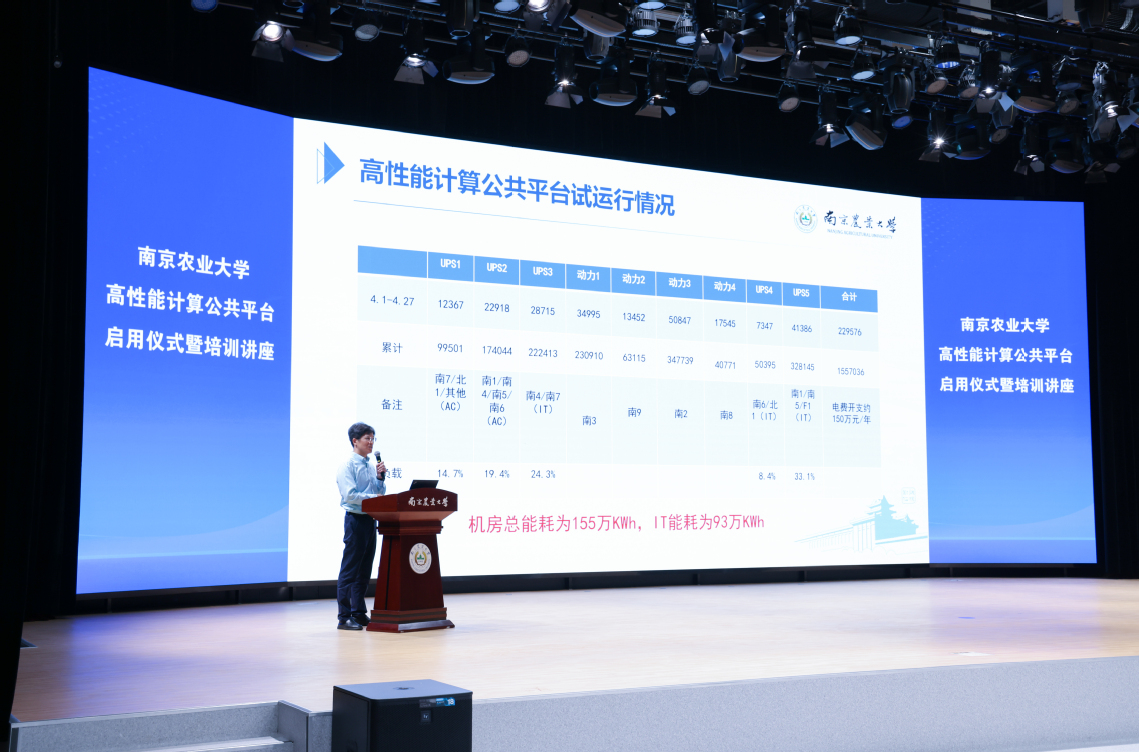 启动仪式后,信息管理学院王东波教授的“农政大模型构建及应用”,前沿交叉学院朱志涛老师的“高性能计算在农业科学计算中的前沿应用”两个专题讲座给在座师生展现了高性能计算在农业领域的最新应用成果和方向。高性能计算中心吉翔主任对平台的申请流程及收费细则作了介绍,运维单位技术工程师作了HPC平台和AI平台的使用讲座。