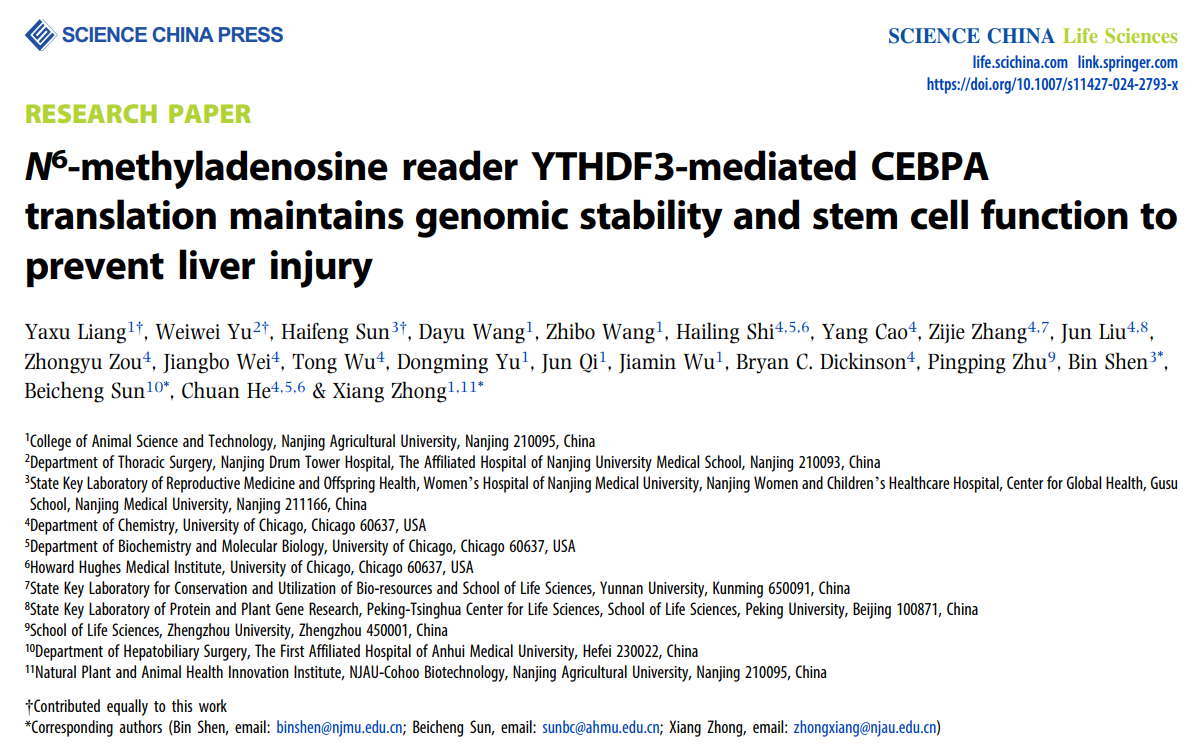 近日,Science China Life Sciences(《中国科学:生命科学》英文版)在线发表ios版雷竞技官网钟翔教授、安徽医科大学第一附属医院孙倍成教授、南京医科大学沈彬教授和芝加哥大学何川教授团队合作题为“N6-methyladenosine reader YTHDF3-mediated CEBPA translation maintains genomic stability and stem cell function to prevent liver injury”的最新研究性论文,首次揭示m6A RNA修饰阅读蛋白YTHDF3通过促进转录因子CEBPA的翻译,维持肝脏基因组稳定性及干细胞功能,从而抵御肝损伤。该发现为肝硬化、肝癌等疾病的治疗提供了新方向,为保障动物肝脏健康的营养调控技术提供新思路。