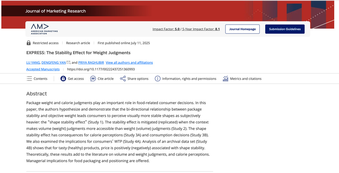 近日,我校经管学院杨璐副教授、上海纽约大学严登峰副教授、纽约大学Priya Raghubir教授的合作论文“The Stability Effect for Weight Judgments”在市场营销领域顶级期刊Journal of Marketing Research(简称JMR)发表。