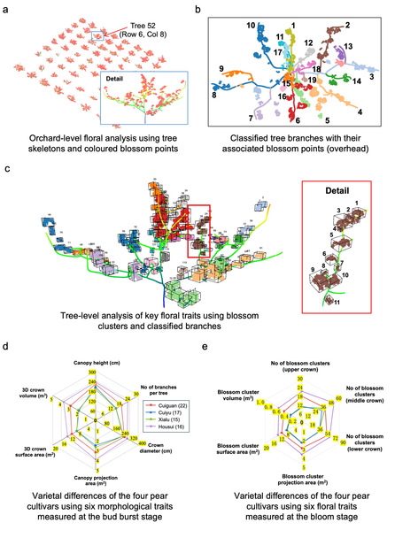 图2 应用OrchardQuant-3D方法分析梨树的关键开花性状和品种差异