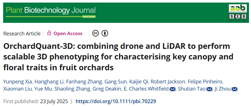 近日,ios版雷竞技官网前沿交叉研究院周济教授团队在国际植物科学期刊Plant Biotechnology Journal在线发表了题为《OrchardQuant-3D: combining drone and LiDAR to perform scalable 3D phenotyping for characterising key canopy and floral traits in fruit orchard》的最新研究成果。