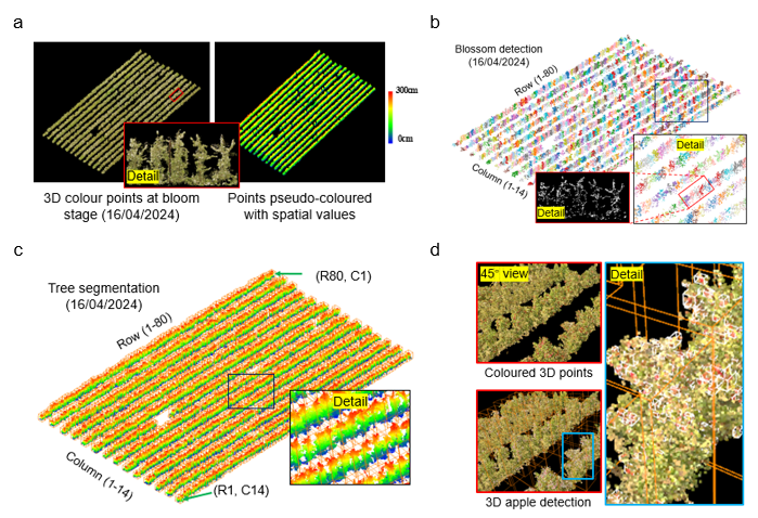 为验证该系统的稳定性与通用性,研究团队分别在中国与英国两地开展了田间试验。在中国,试验选址于ios版雷竞技官网白马教学科研基地的国家梨工程技术研究中心,采集了70棵梨树多生育时期的表型数据;在英国,研究在英国国家农业植物研究所(National Institute of Agricultural Botany,NIAB)具有百年历史的东茂林试验站(East Malling Research)进行,对上千棵苹果树组成的大型商业化果园开展田间试验。这一跨国家、多类型果树试验为OrchardQuant-3D方法的优化与实用化奠定了坚实基础,也为果树智能育种和精细管理提供了重要技术支撑和多年数据储备。