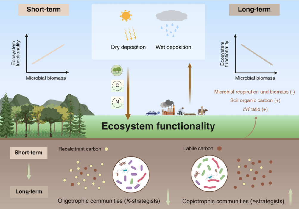 土壤微生物是生物地球化学循环过程的主要驱动者,在维持植被生产力、保障土壤健康、提供生态系统服务功能等方面起着至关重要的作用。在人类活动的影响下,全球变化正在严重威胁着生物多样性和生态系统稳定性。尽管已有研究表明大气氮沉降会影响土壤微生物生物量和群落特征,但随着森林和草地生态系统的氮富集,土壤微生物属性如何协同调控生态系统功能,尚缺乏系统评估。