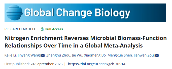 近日,ios版雷竞技官网邹建文教授团队在全球变化研究领域国际权威学术期刊《Global Change Biology》发表了题为“Nitrogen enrichment reverses microbial biomass-function relationships over time in a global meta-analysis”的研究论文。该研究系统评估了土壤微生物群落与生态系统功能对氮富集的响应,发现微生物生物量与生态系统功能关系对氮富集响应的适应性动态逆转,并探讨了土壤微生物生态机制及其对土壤管理的启示。