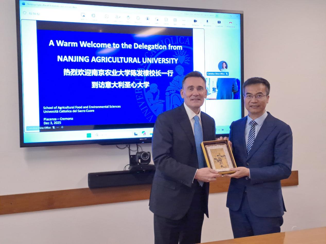 陈发棣一行访问意大利天主教圣心大学(Università Cattolica del Sacro Cuore),与副校长Edilio Mazzoleni座谈并签署与意大利天主教圣心大学、法国罗纳-阿尔卑斯高等农业与食品加工技术学院(ISARA)共同签署“3+1+1”本硕衔接双学位项目协议。双方回顾了两校良好的合作历史和基础, 期待继续加强对等互惠交流,在农业资源保护、生态可持续发展等重点领域开发更多优质项目,为中意高校教育合作树立典范。