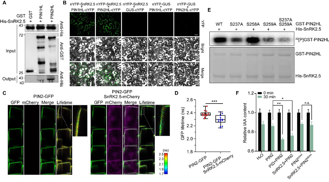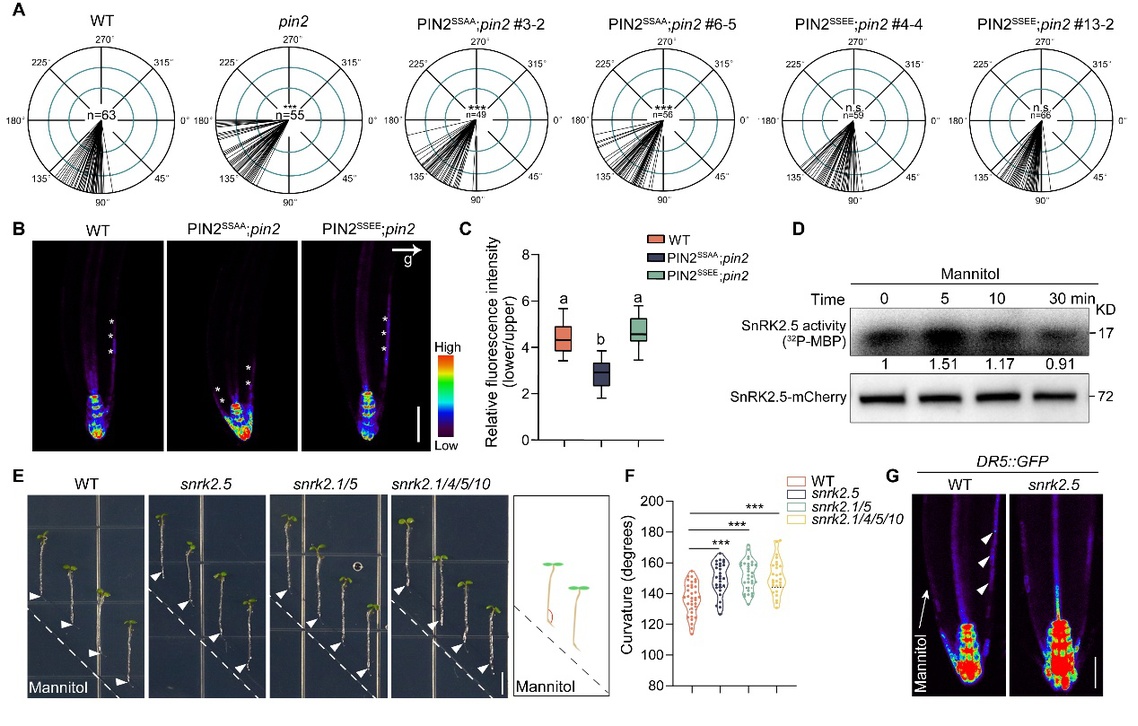 植物生长离不开水分,当遭遇干旱或盐碱环境时,根系会启动一系列适应性反应:比如向水分充足的方向弯曲(向水性)、减缓伸长以减少水分消耗。这些反应的核心是生长素的不对称分布,而生长素的运输主要依赖PIN-FORMED(PIN)家族转运蛋白,其中PIN2在根系表皮细胞中负责生长素的极性运输,是调控根向地性、向水性的关键“搬运工”。此前研究发现,渗透胁迫会干扰PIN蛋白的定位和活性,但具体调控机制尚不明确。SNF1相关蛋白激酶2(SnRK2)家族是植物应对渗透胁迫的核心信号分子,其中SnRK2.2/3/6依赖ABA发挥作用,而SnRK2.5等成员则通过ABA非依赖途径响应胁迫。然而,ABA非依赖途径家族SnRK2如何与生长素运输系统联动,帮助根系适应渗透胁迫,仍是未知。