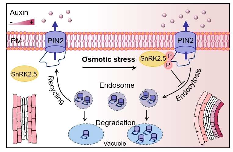 为探究这一磷酸化事件的生理意义,团队聚焦根系的两个核心反应:向地性(根向重力方向生长)和渗透胁迫适应。在向地性实验中,pin2突变体根系无法正常弯曲,而转入野生型PIN2WT或持续磷酸化的PIN2SSEE后,根系能恢复向地性;但转入PIN2SSAA的突变体,向地性缺陷仍未改善。通过生长素报告基因DR5::GFP观察发现,PIN2SSAA植株的根系生长素分布紊乱,无法形成重力诱导的不对称积累,这表明SnRK2.5介导的PIN2磷酸化,是生长素不对称分布和根系向地性的关键。研究发现,snrk2.5突变体根系对渗透胁迫更敏感,无法有效避开高渗区域。进一步观察显示,渗透胁迫会诱导SnRK2.5激活,进而减少PIN2的内吞和液泡降解(图2)。上述结果表明,SnRK2.5通过磷酸化稳定PIN2在细胞膜上的丰度,并激活PIN2的转运活性,确保生长素运输在胁迫下的正常进行。