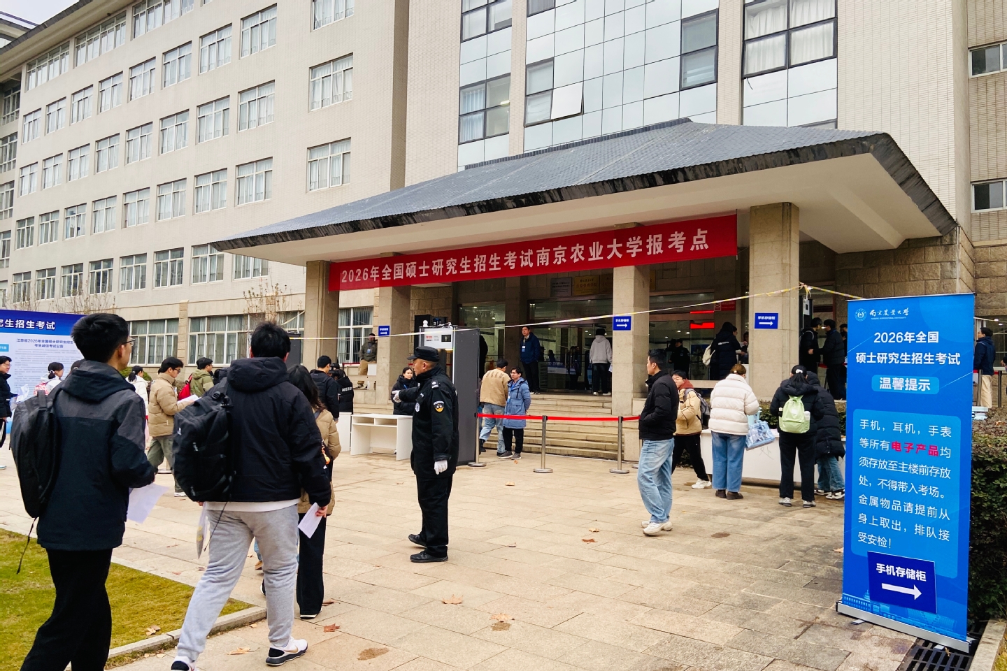 12月20日至21日,我校作为2026年全国硕士研究生招生考试的报考点,承担南京地区报考南农和南体两个高校的考试任务,本次共有考生1911人,设置考场71个,其中南农卫岗校区考场62个,南体灵谷寺路校区考场9个。我校选聘监考员、各类安全保障人员、学生志愿者等共计320余人,切实保障试卷安全、扎实做好入场安检,全程提供考生服务。