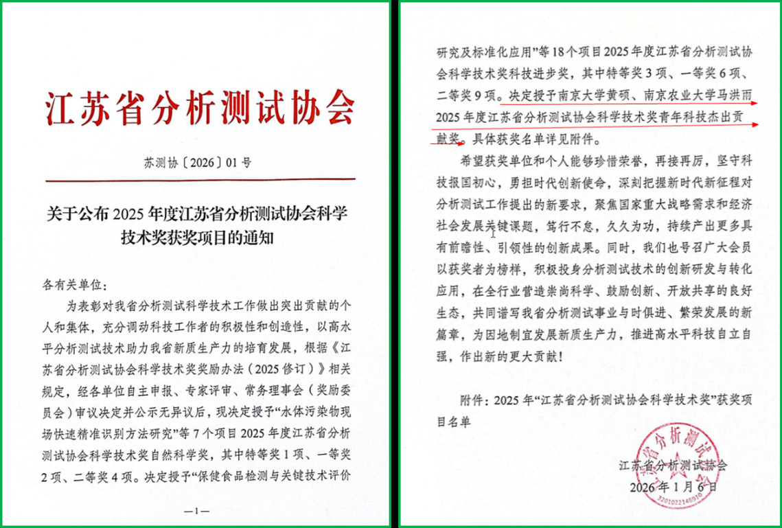 近日,江苏省分析测试协会公布了2025年度科学技术奖获奖名单,我校现代农业分析测试中心教授级高级实验师马洪雨荣获江苏省分析测试协会科学技术奖“青年科技杰出贡献奖”。