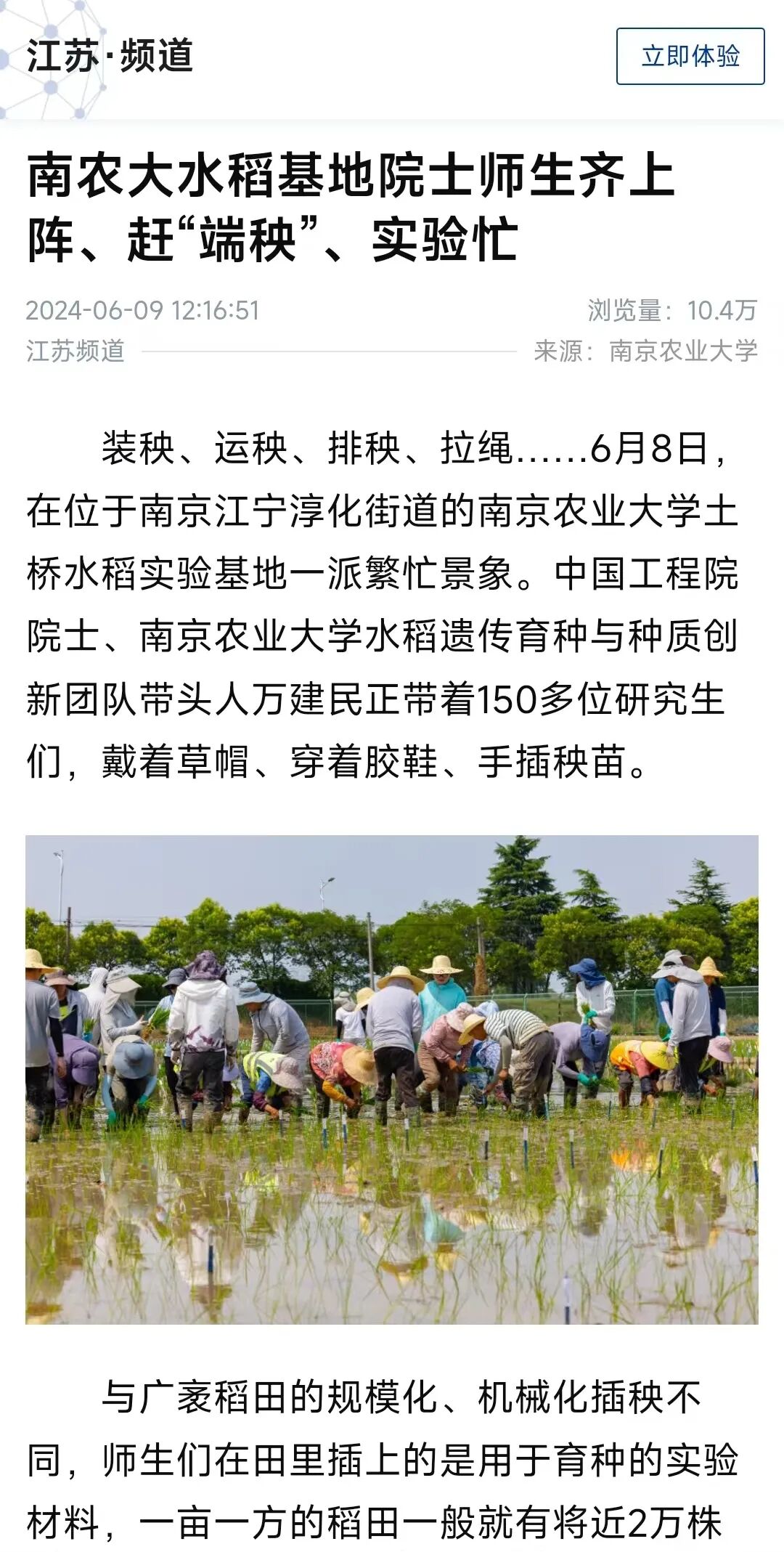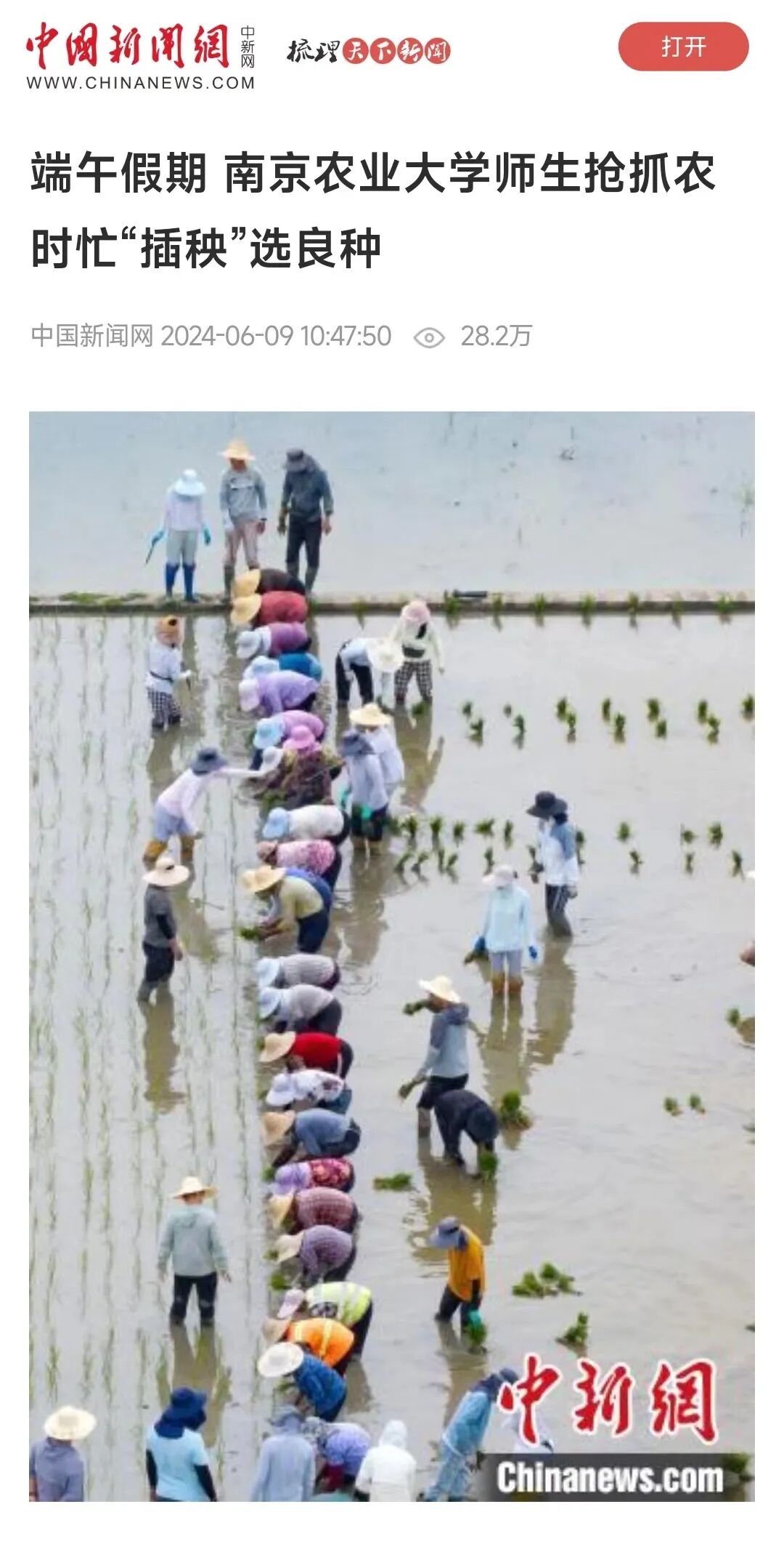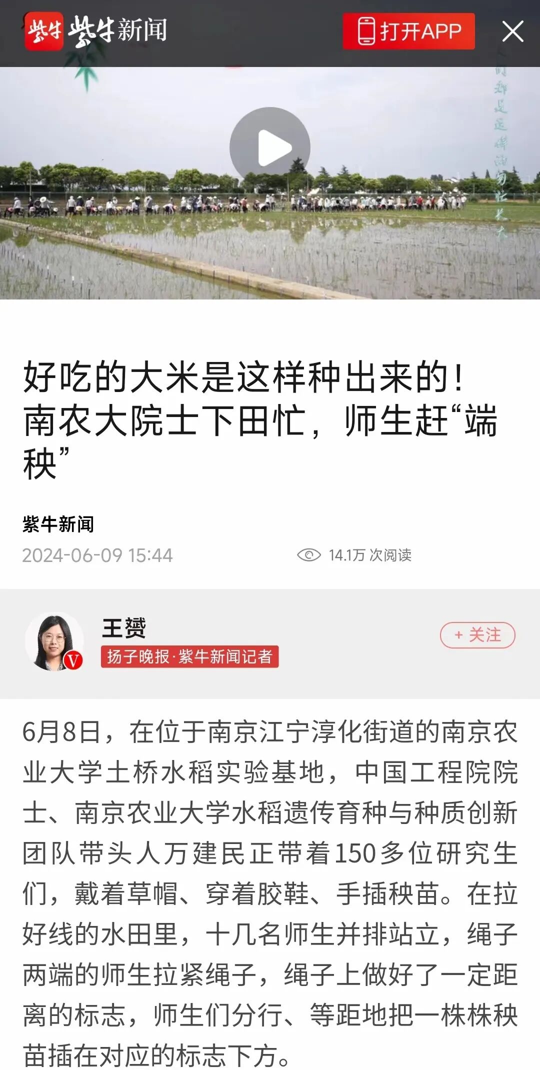 6月8日,在位于南京江宁淳化街道的ios版雷竞技官网土桥水稻实验基地,中国工程院院士、ios版雷竞技官网水稻遗传育种与种质创新团队带头人万建民正带着150多位研究生们,戴着草帽、穿着胶鞋、手插秧苗。在拉好线的水田里,十几名师生并排站立,绳子两端的师生拉紧绳子,绳子上做好了一定距离的标志,师生们分行、等距地把一株株秧苗插在对应的标志下方。