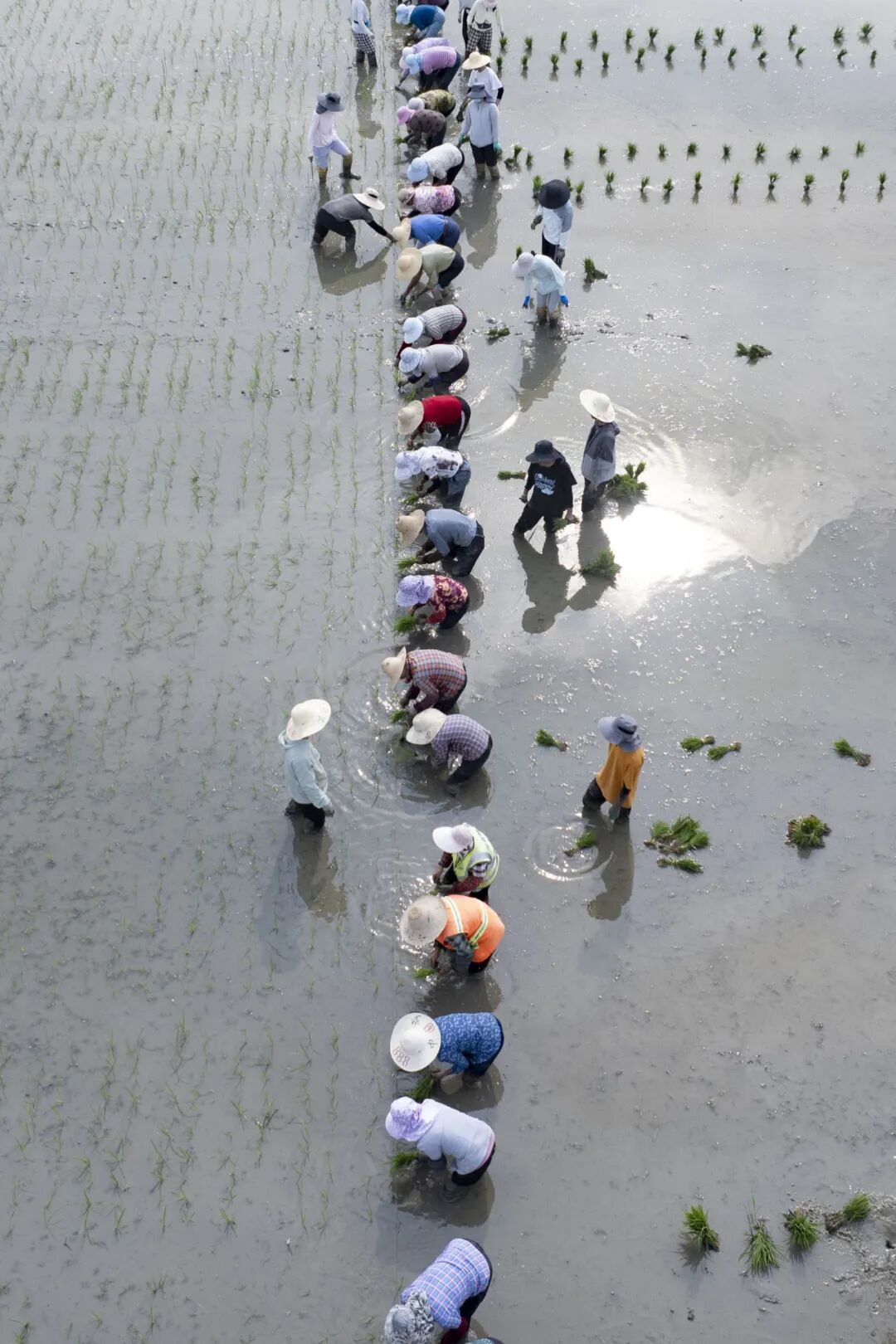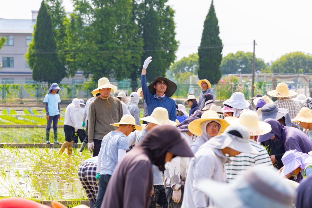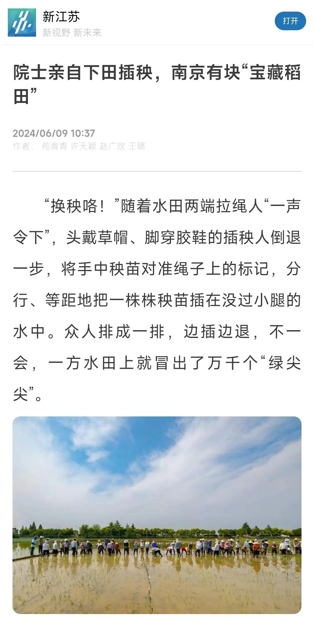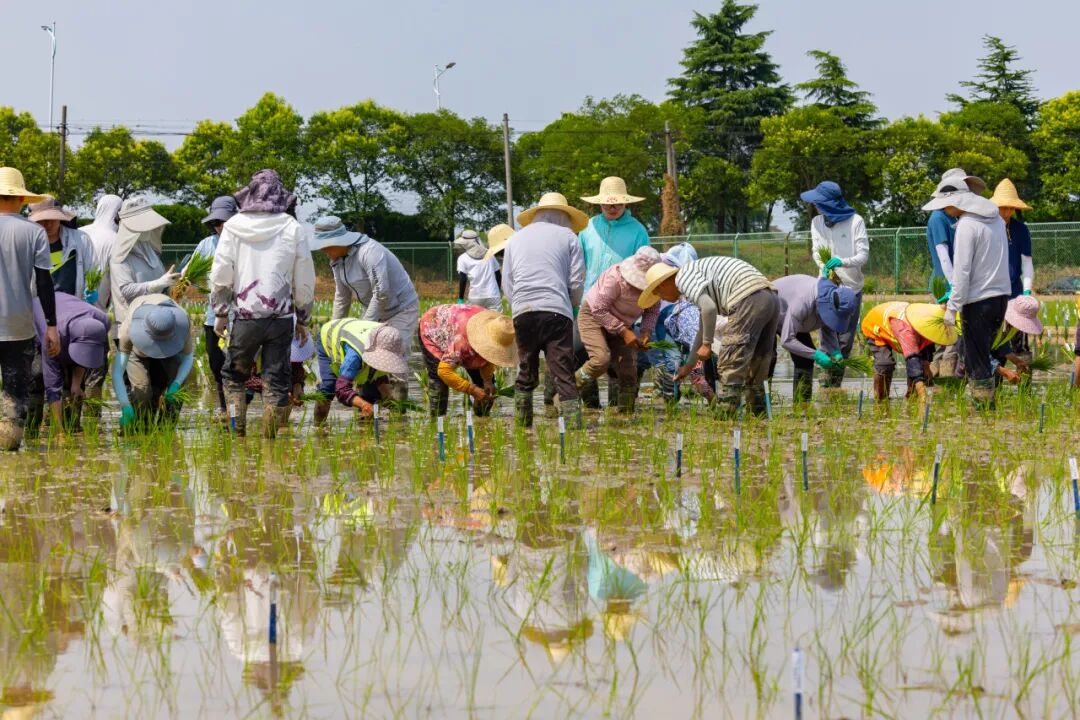 6月8日,在位于南京江宁淳化街道的ios版雷竞技官网土桥水稻实验基地,中国工程院院士、ios版雷竞技官网水稻遗传育种与种质创新团队带头人万建民正带着150多位研究生们,戴着草帽、穿着胶鞋、手插秧苗。在拉好线的水田里,十几名师生并排站立,绳子两端的师生拉紧绳子,绳子上做好了一定距离的标志,师生们分行、等距地把一株株秧苗插在对应的标志下方。