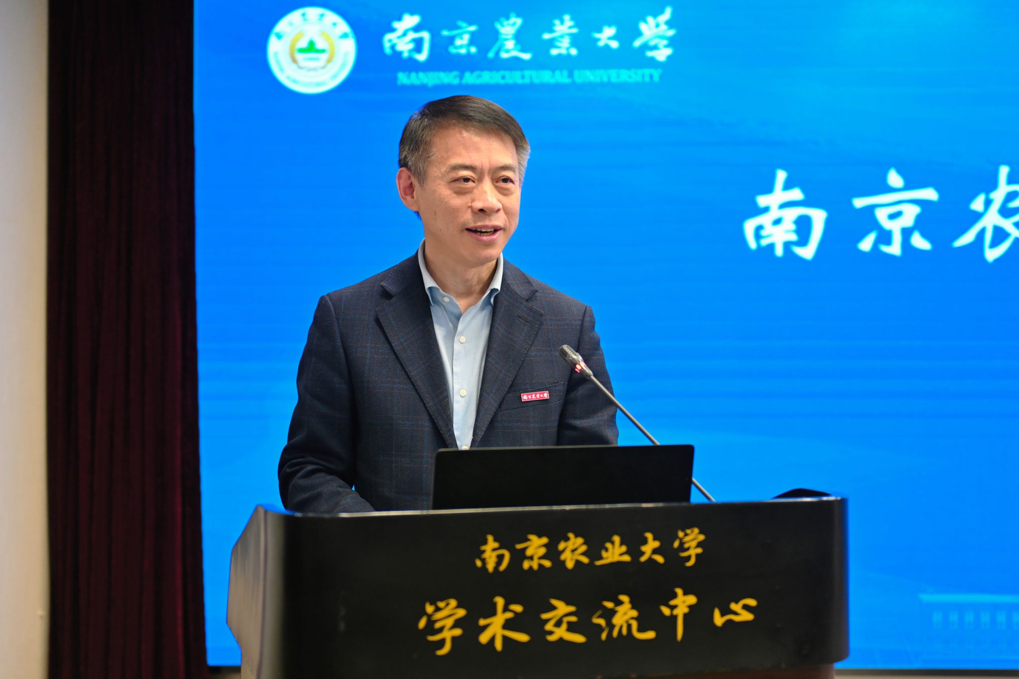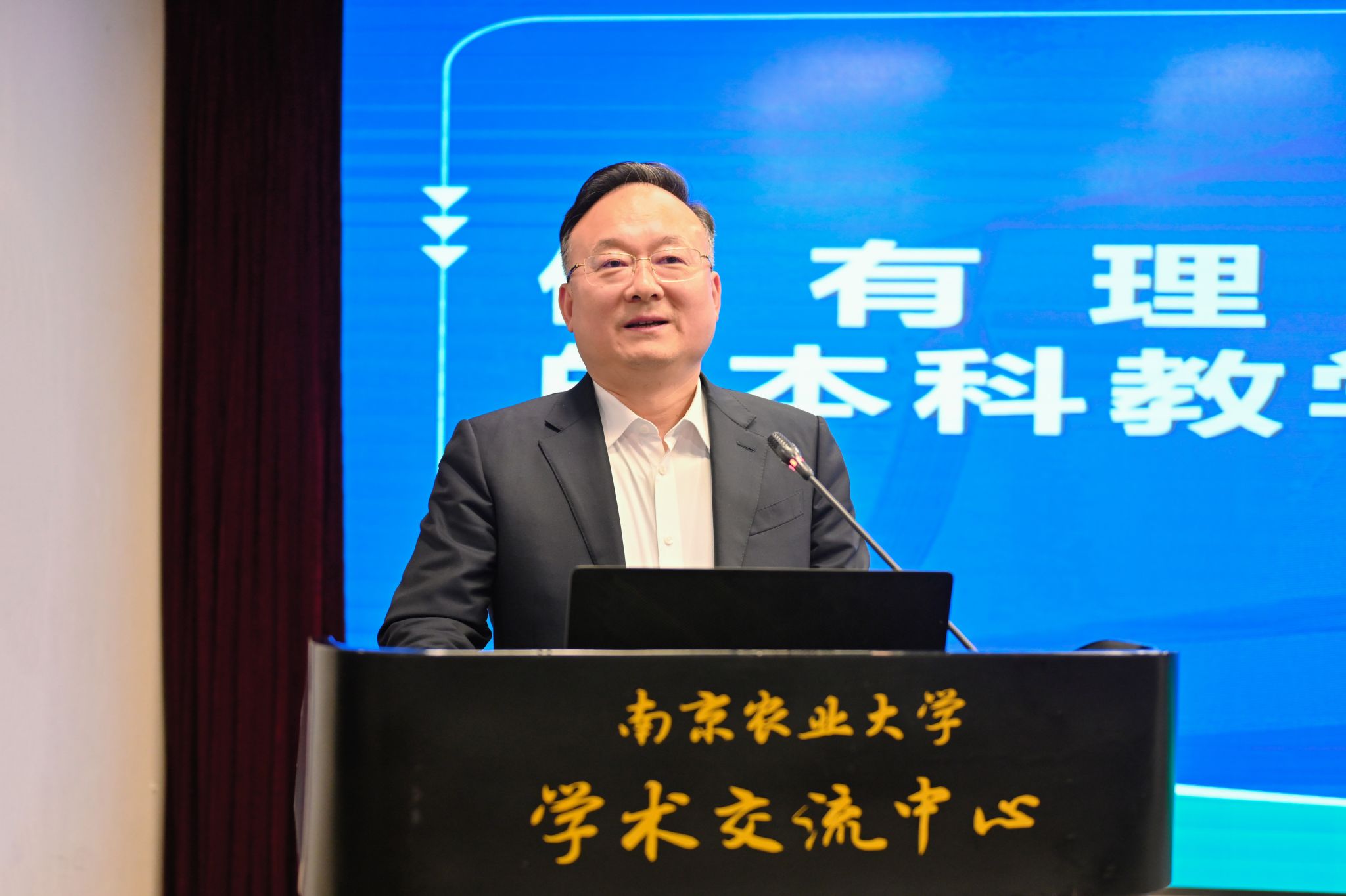 王春春致辞,他对各校参会代表的到来表示热烈欢迎,对会议的召开表示衷心祝贺,并对江苏省教育厅和兄弟院校长期以来的支持表示诚挚感谢。王春春指出,近年来学校紧紧围绕“强国建设,南农何为”时代命题,以新时代教育评价改革为牵引,以教育科技人才体制机制改革为驱动,以“四新”建设为抓手,推动教育教学深化改革,提高人才培养质量成效。他表示,未来学校将牢牢把握教育的政治属性、人民属性、战略属性,深入贯彻落实教育部党组和江苏省委重要部署,认真落实江苏省教育厅工作要求,与兄弟院校交流互鉴、协同发力,共同推动江苏在推动科技创新和产业创新融合上打头阵、在推进深层次改革和高水平开放上勇争先、在落实国家重大发展战略上走在前。