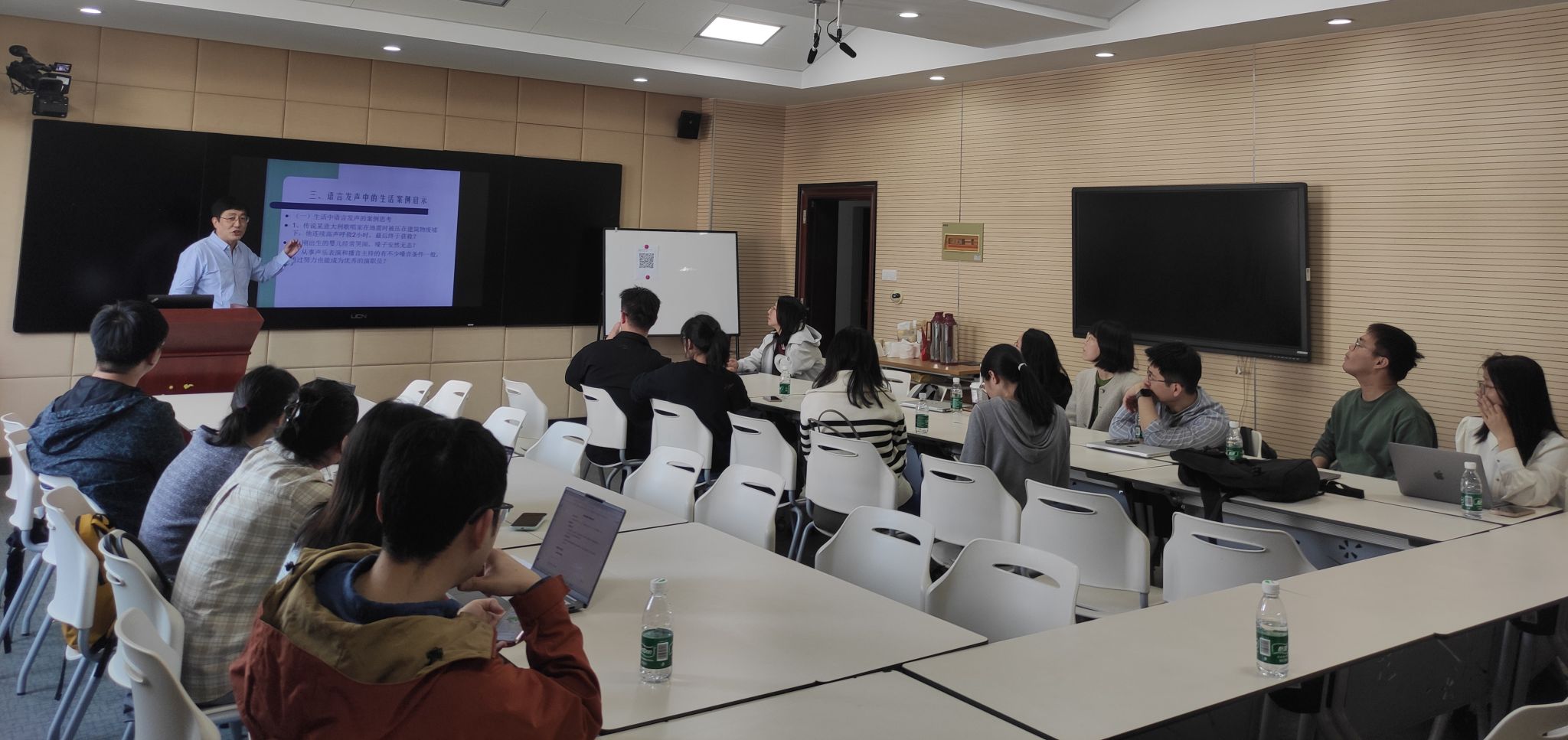 3月26日下午,主题为“语言发声基础及训练”教学分享活动在教师发展服务空间D620举办,周辉国副教授围绕语音发声中的常见问题、发声状态经验谈、实践联系和嗓音保护四个方面进行了详细阐述,结合实际案例进行了认真、细致讲解。