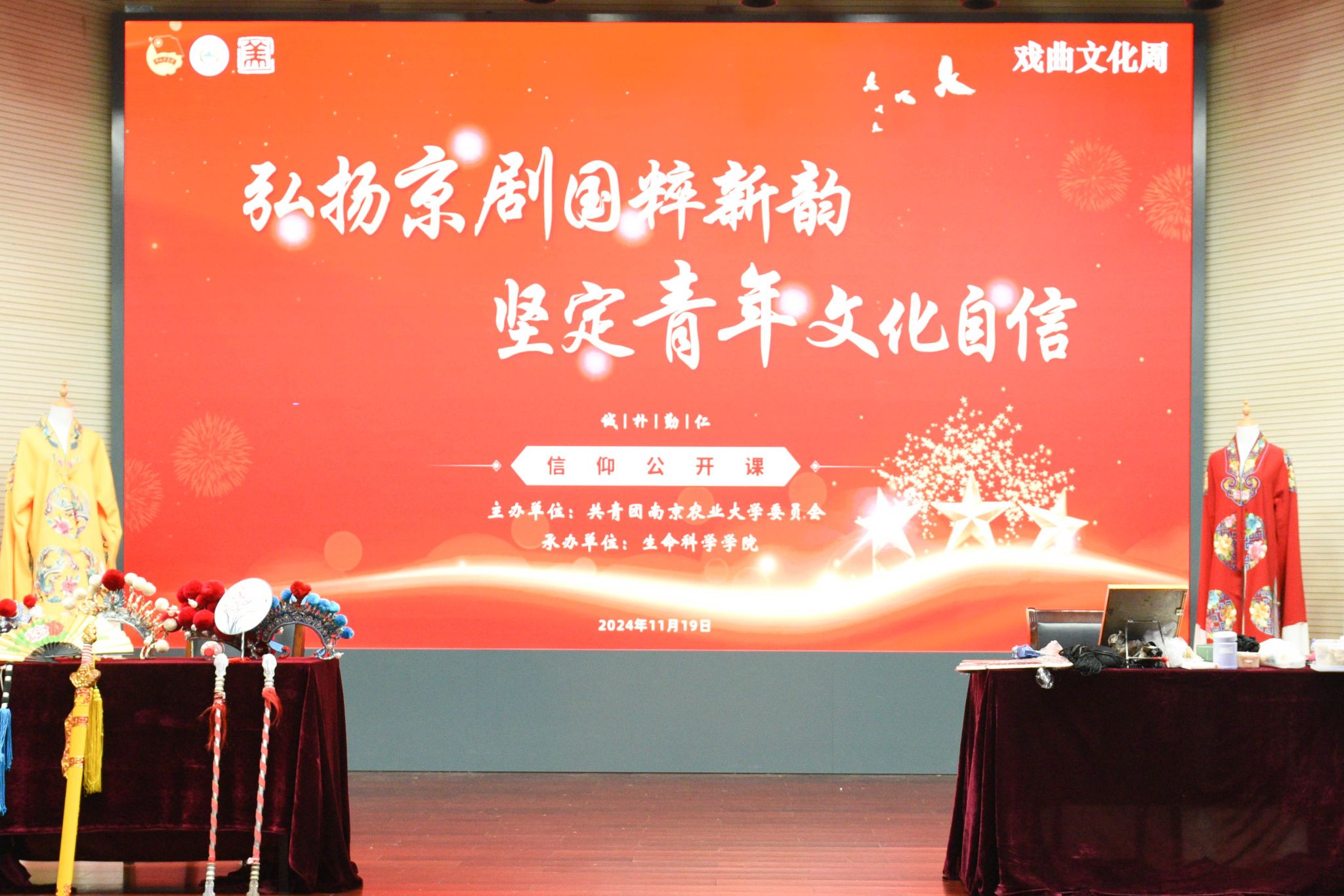 梨园风华,戏曲魅力,高飞老师的精彩讲解为我们敲开了古老戏曲艺术的大门,让京剧艺术的暖风轻抚人面,暖人心田,令在场的南农学子如沐春风。让艺术浸润人生,让美好启迪心灵,本次讲堂切实地将美育浸润行动融入到学校艺术教育的过程中,注重挖掘和传承戏曲文化,使美育成为连接过去与未来的桥梁,成为南农学子塑造崇高道德情操和良好品德的基石,有力地推动了南农美育建设。