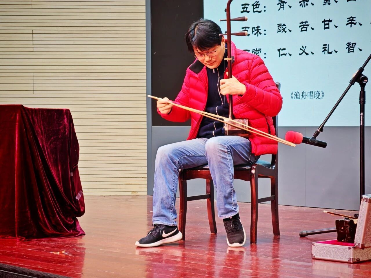 理论阐释之外,林教授还现场演绎《二泉映月》《茉莉花》等经典曲目。弓弦之间,音色如诉,旋律婉转,国乐“近人声”的特质与线性旋律的美感得以生动呈现,让观众不仅听懂理论,更“听见”国乐之美。
