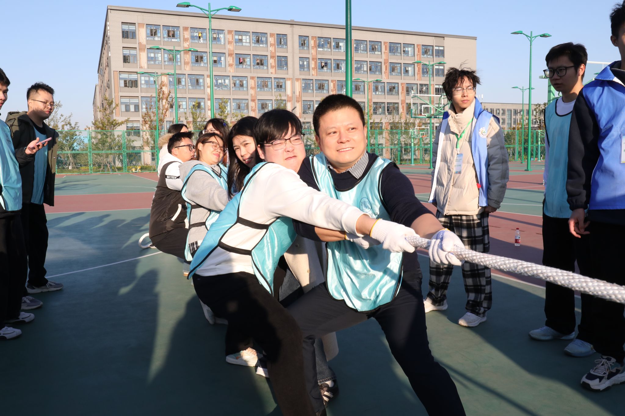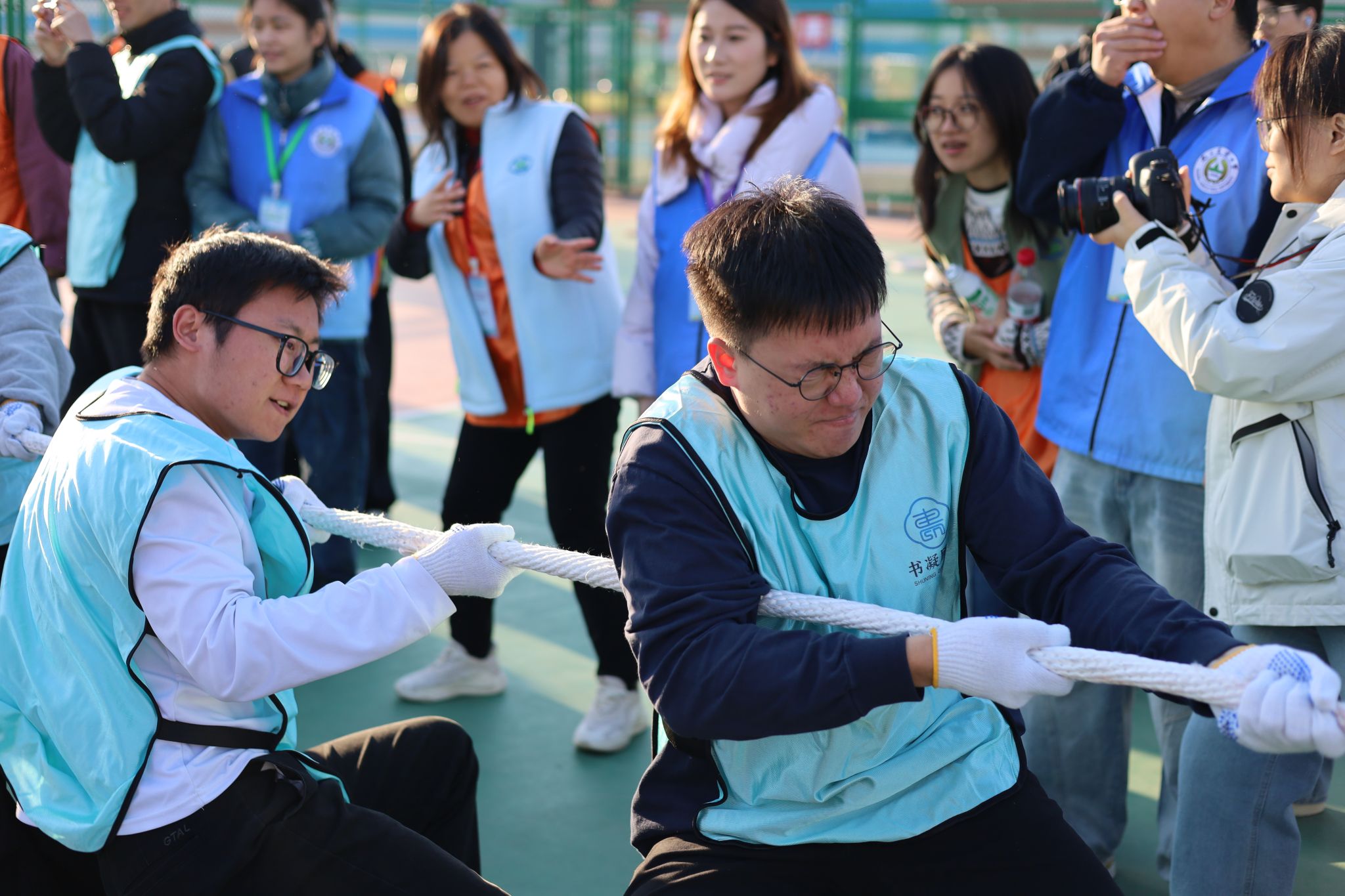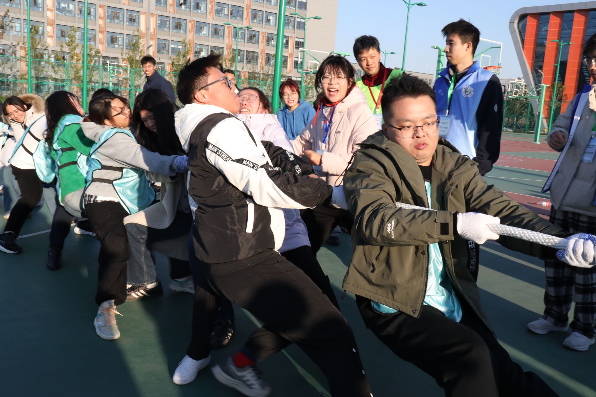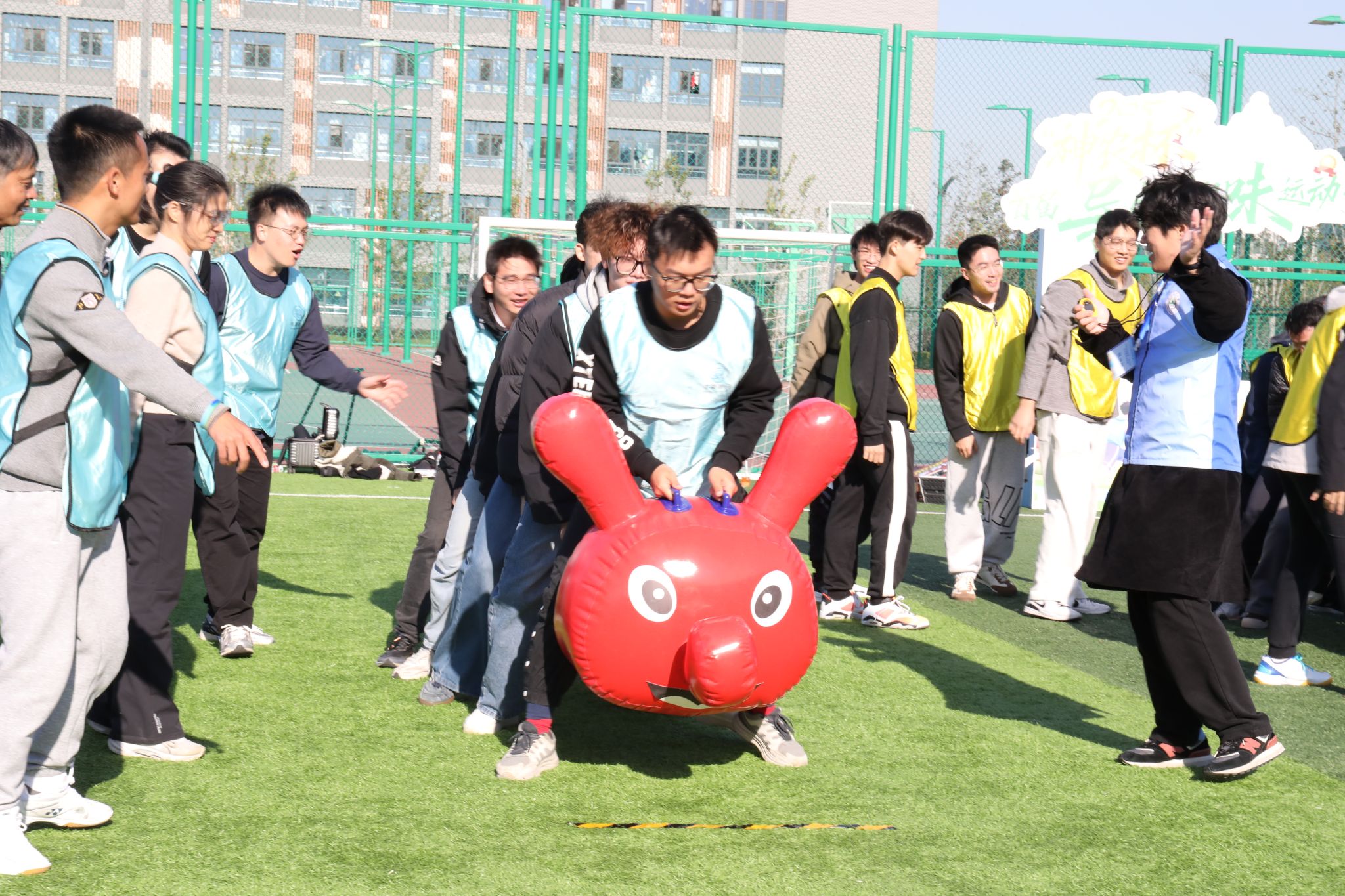 赛场上,我院师生和谐奋进的场景随处可见。“研途·学海滚滚”项目中,师生协同托举道具,以统一节奏稳步前行,额间汗珠与默契眼神相映成趣;“研海破浪行”环节,双方配合紧密、高效联动,现场助威声此起彼伏;“稻田越野赛”里,师生交接瞬间的有力击掌,既是任务传递,更是信任彰显;集体拔河时,全体队员凝心聚力、奋力拼搏,充分展现团队韧性。待赛师生在赛场周边组成后援团队,实时助威鼓劲,并提供补给、装备整理等保障服务,场内外高效联动进一步凝聚团队合力,为参赛队员筑牢坚实后盾。