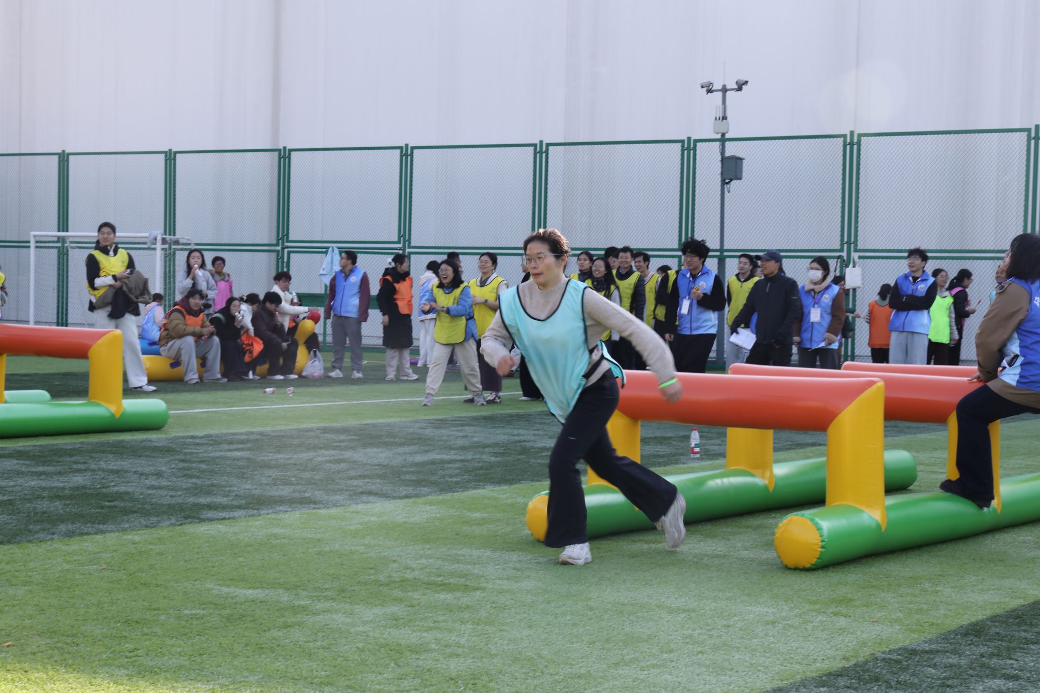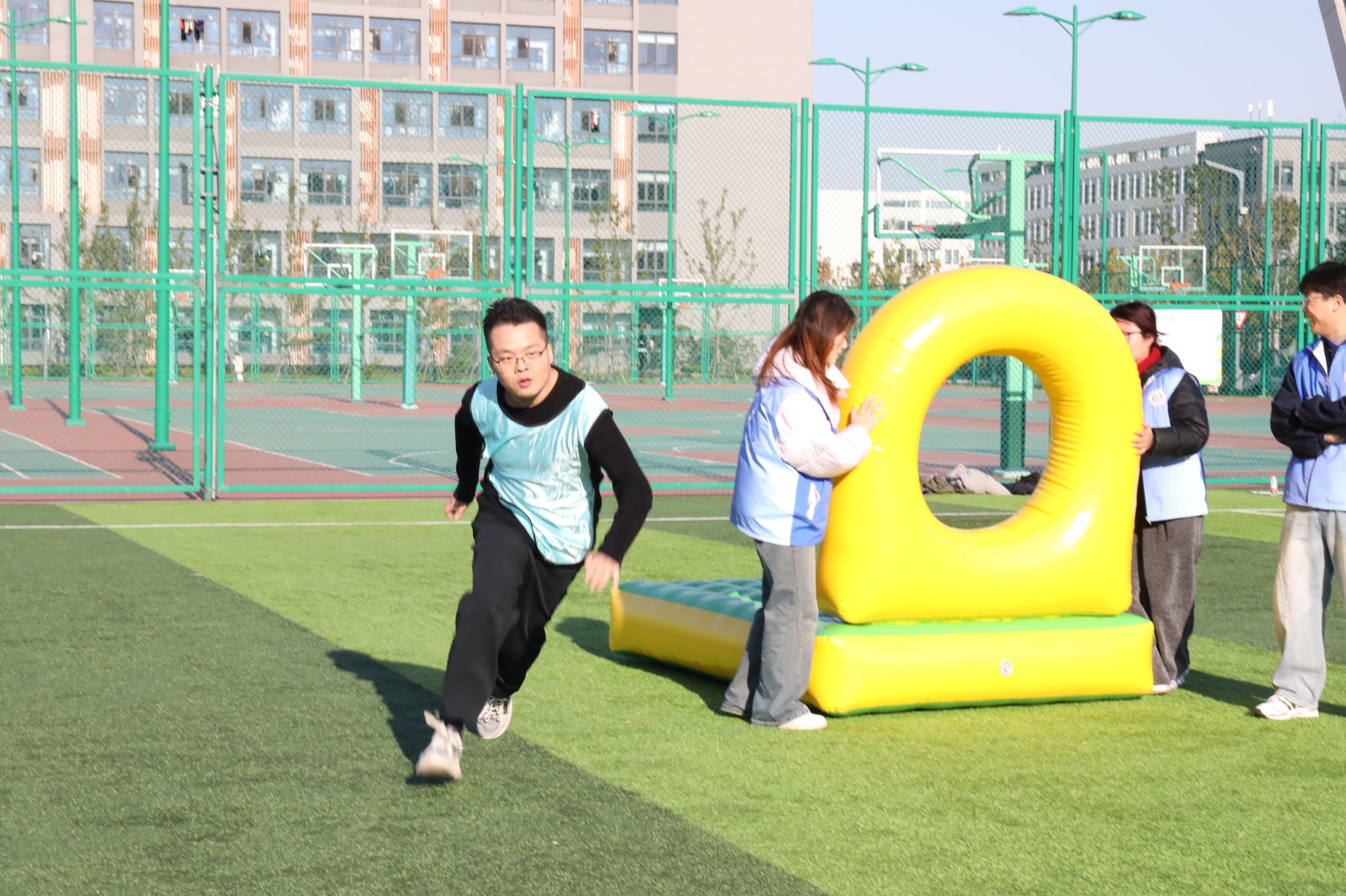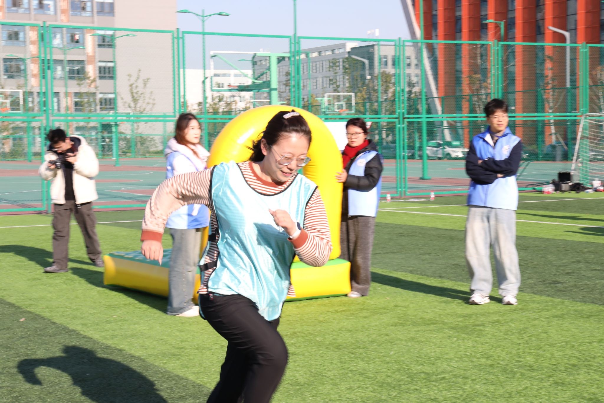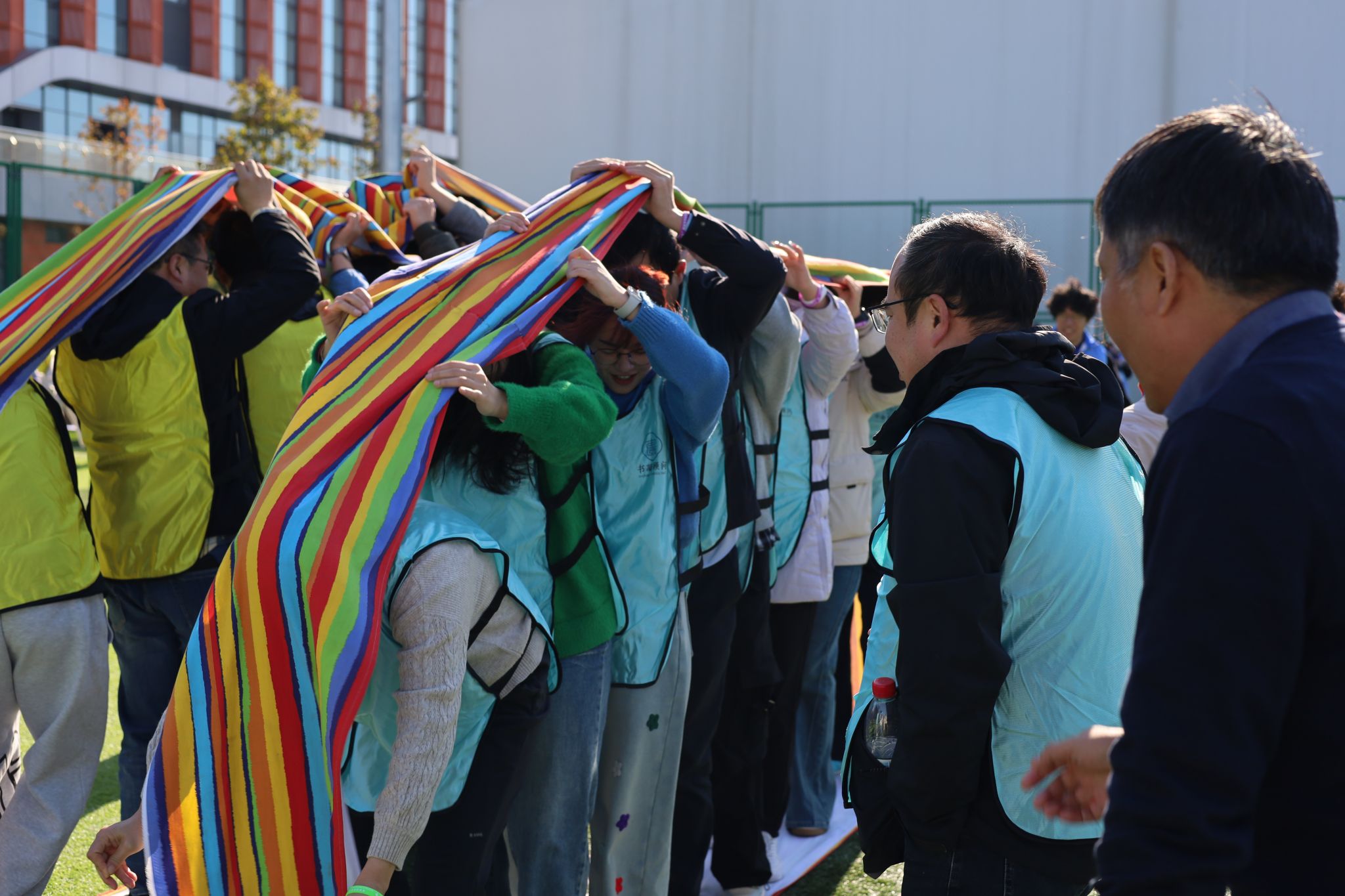 赛场上,我院师生和谐奋进的场景随处可见。“研途·学海滚滚”项目中,师生协同托举道具,以统一节奏稳步前行,额间汗珠与默契眼神相映成趣;“研海破浪行”环节,双方配合紧密、高效联动,现场助威声此起彼伏;“稻田越野赛”里,师生交接瞬间的有力击掌,既是任务传递,更是信任彰显;集体拔河时,全体队员凝心聚力、奋力拼搏,充分展现团队韧性。待赛师生在赛场周边组成后援团队,实时助威鼓劲,并提供补给、装备整理等保障服务,场内外高效联动进一步凝聚团队合力,为参赛队员筑牢坚实后盾。