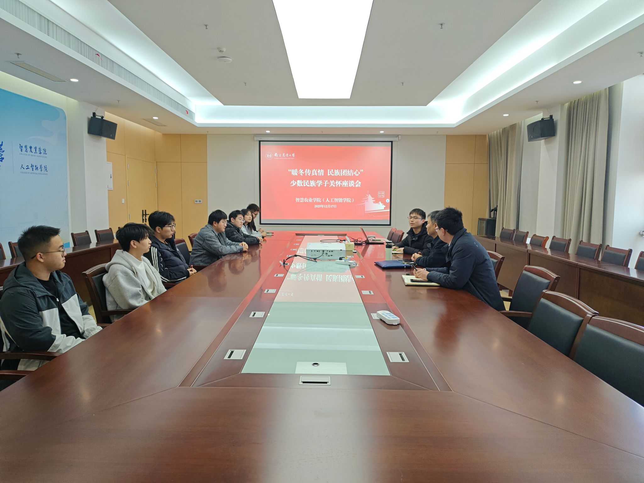 为深入贯彻民族团结进步理念,切实关怀少数民族学子成长成才,12月17日,智慧农业学院(人工智能学院)以“暖冬传真情 民族团结心”为主题,成功举办少数民族学生座谈会。智慧农业学院(人工智能学院)党委书记李骅、党委副书记吕一雷、专职辅导员林军及少数民族学生代表齐聚一堂,共赴这场温暖而有意义的成长之约。