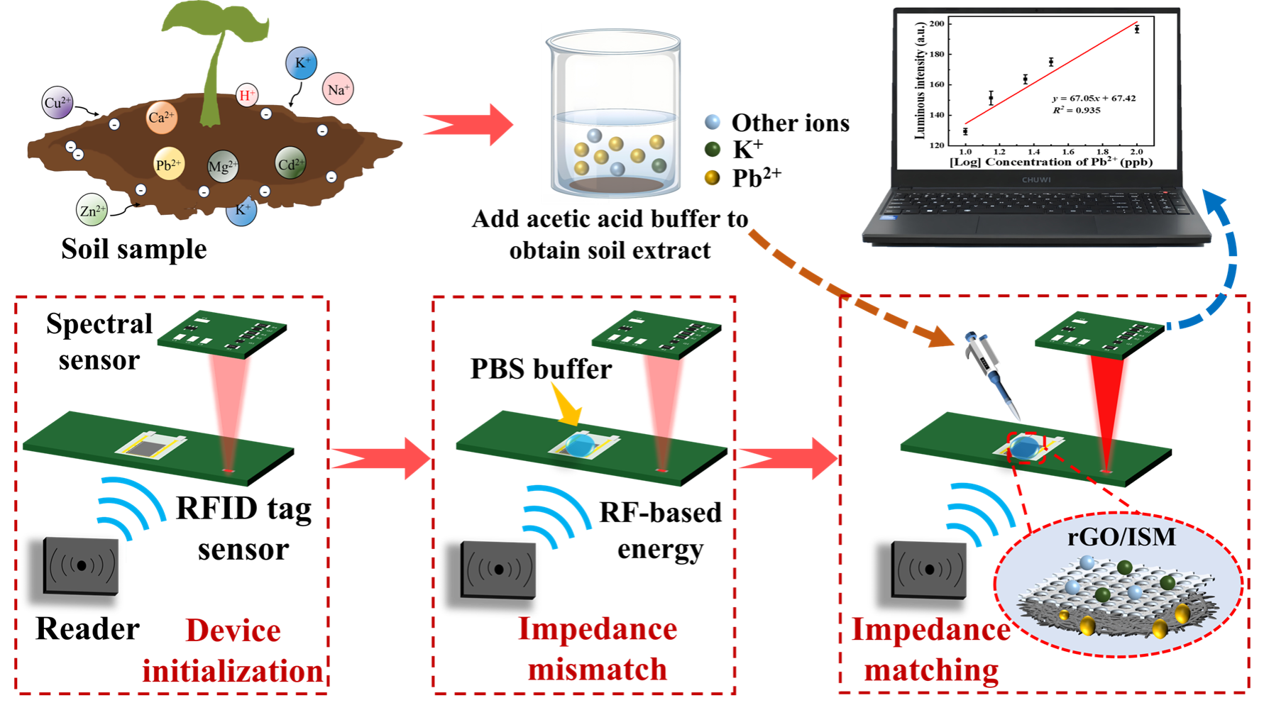 围绕农业土壤重金属污染危害生态安全和公众健康(重金属经作物富集可引发人体神经损伤、肾脏病变)这一问题,面向传统检测技术依赖实验室大型仪器(如ICP-MS)、流程繁琐、成本高昂这一行业瓶颈,ios版雷竞技官网赵国副教授团队成功研制首套集成化无线无源射频土壤铅污染检测系统。该系统结合还原氧化石墨烯(rGO)和复合铅离子选择性敏感膜(ISM),构筑异质传感单元——当土壤浸出液中的Pb²⁺被rGO/ISM特异性吸附后,其电子传输特性改变将触发RFID标签式传感器的阻抗变化,通过射频阻抗失配原理,将阻抗失配度转化为RFID传感器上626 nm LED光源的发光强度;内置微尺度光谱芯片即可对光强数据进行即时解析,通过建立动态光-浓度关联模型,实现最快2秒的铅浓度精准检测(检测限达1.96 μg/L)。与ICP-MS测试数据的交叉验证实验表明,其检测回收率达99%-101%,均方根误差均小于5.2 μg/kg。该技术摒弃传统矢量网络分析仪等笨重外设,采用模块化可插拔结构和可替换传感组件,大大降低检测成本;配套研发的便携式检测设备为土壤重金属污染防治提供"早发现、早治理"的智能化解决方案。