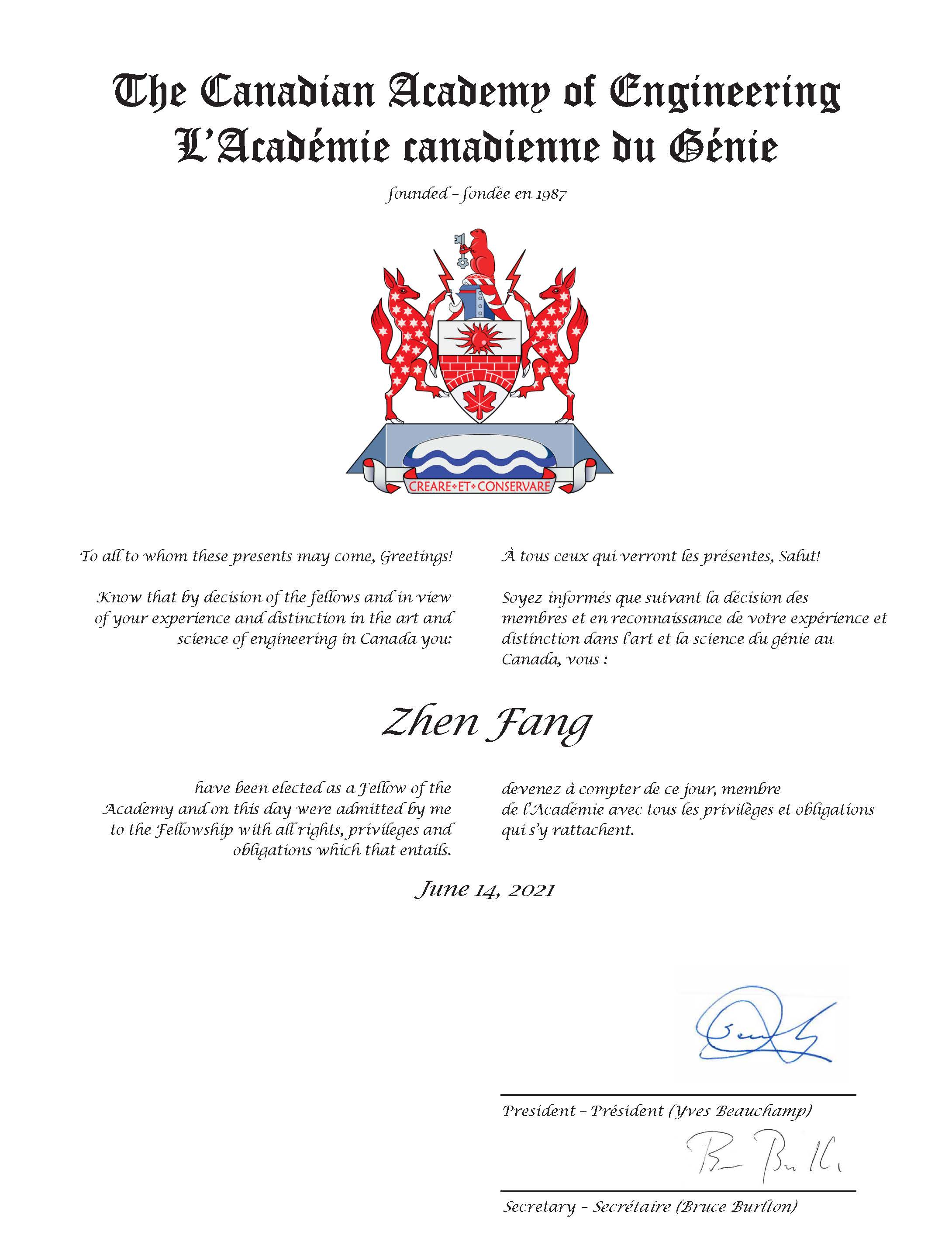 方真教授当选加拿大工程院院士Prof. Zhen Fang has been elected as 2021 Fellow of the Canadian Academy of Engineering (CAE)