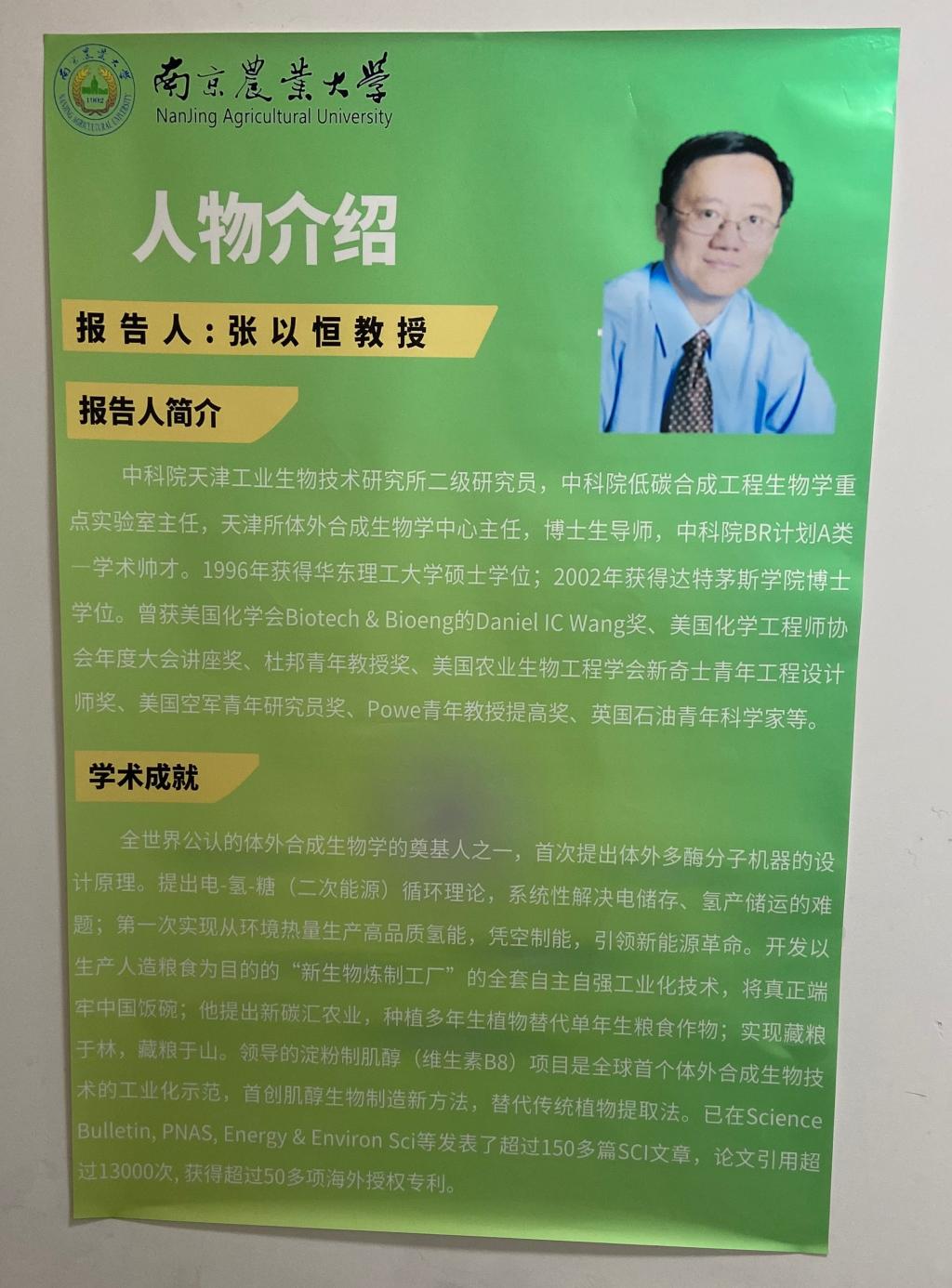 2023年4月15日,应方真教授邀请,中科院天津工业生物技术所体外合成生物学中心主任张以恒教授于上午10点在育贤楼C502会议室为生物能源组和研究生做学术讲座,主题为“农业工业化+”:用颠覆性技术端稳中国饭碗为主题。