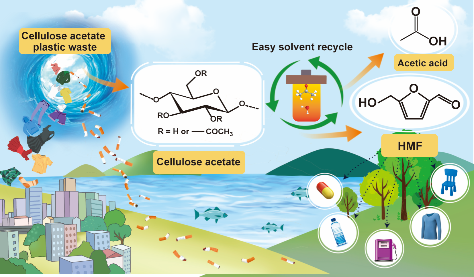 Cellulose acetate (CA) is a widely used cellulose derivative, commonly applied in cigarette filters, textiles, and plastics. The extensive use of CA-based products generates large amounts of plastic waste. Due to its low biodegradability, CA has become a “hidden source of pollution,” persisting in the environment for more than 10 years, with degradation rates decreasing sharply as the degree of acetylation increases. This poses severe environmental challenges.
