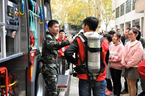 首先由消防员为新生讲解消防器材,增加同学们对消防车、消防软管、水枪喷头、消防服等消防器具的了解。