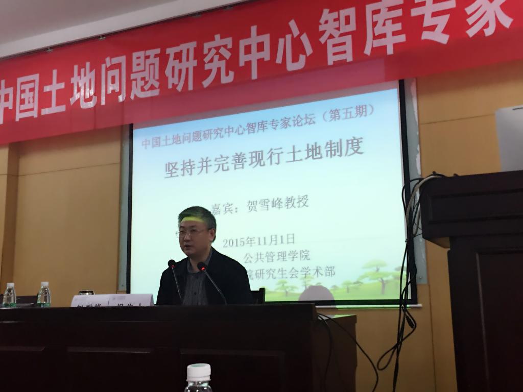 2015年11月1日下午,中国土地问题研究中心·智库第五期专家论坛在公共管理学院学术报告厅举行,论坛邀请华中科技大学中国乡村治理研究中心主任贺雪峰教授作了一场主题为《坚持并完善现行土地制度》的学术报告,报告由公共管理学院陈会广教授主持,100多名师生参加了报告会。