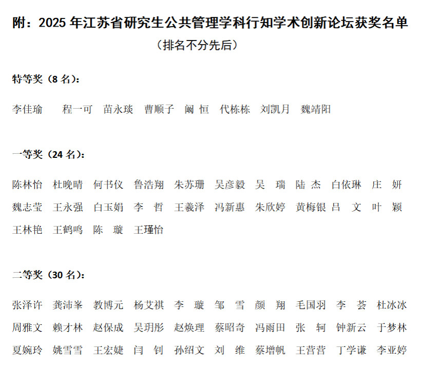 社会治理体系的持续演进,对公共管理学科提出了更高要求,也赋予了这一领域新的使命。面向未来,该学科需要通过更深层次的跨学科融合,以及在理论与实践互动中的持续探索,不断拓宽研究视野、创新方法体系,为社会发展提供更加坚实的智慧支撑与解决方案。至此,2025年江苏省研究生公共管理学科行知学术创新论坛圆满落下帷幕。