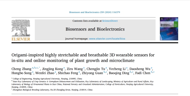 近日,我院张诚副教授在传感器领域著名期刊《Biosensors and Bioelectronics》(IF=12.60)上发表题为“Origami-inspired Highly Stretchable and Breathable 3D Wearable Sensors for In-situ and Online Monitoring of Plant Growth and Microclimate”的研究论文,报道了其在穿戴式植物传感器领域取得的新进展。