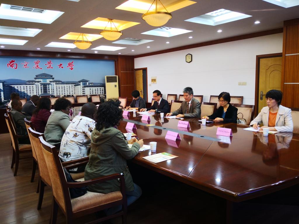 On October 24, Ms. Rakel Jacob, Chairman of the Khomas Provincial Assembly of Namibia, headed a delegation and visited Nanjing Agricultural University (NAU) with a discussion for deepening cooperation in education. Members of the delegation included the mayor of Windhoek, the Special Adviser to the Governor of Khomas, Director for the City Government of Windhoek Affairs and the City Council Affairs. Vice President Hu Feng met with the delegation in the A613 conference room of the Administration Building. Prof. Liu Zhimin, Dean of the College of International Education; Wei Wei, Deputy Director of the International Office, and other relevant personnel from NAU as well as representative students from Namibia attended the meeting. Ms. Xu Weifang, a research associate from the Jiangsu Foreign Affairs Office with her staff, accompanied the delegation.