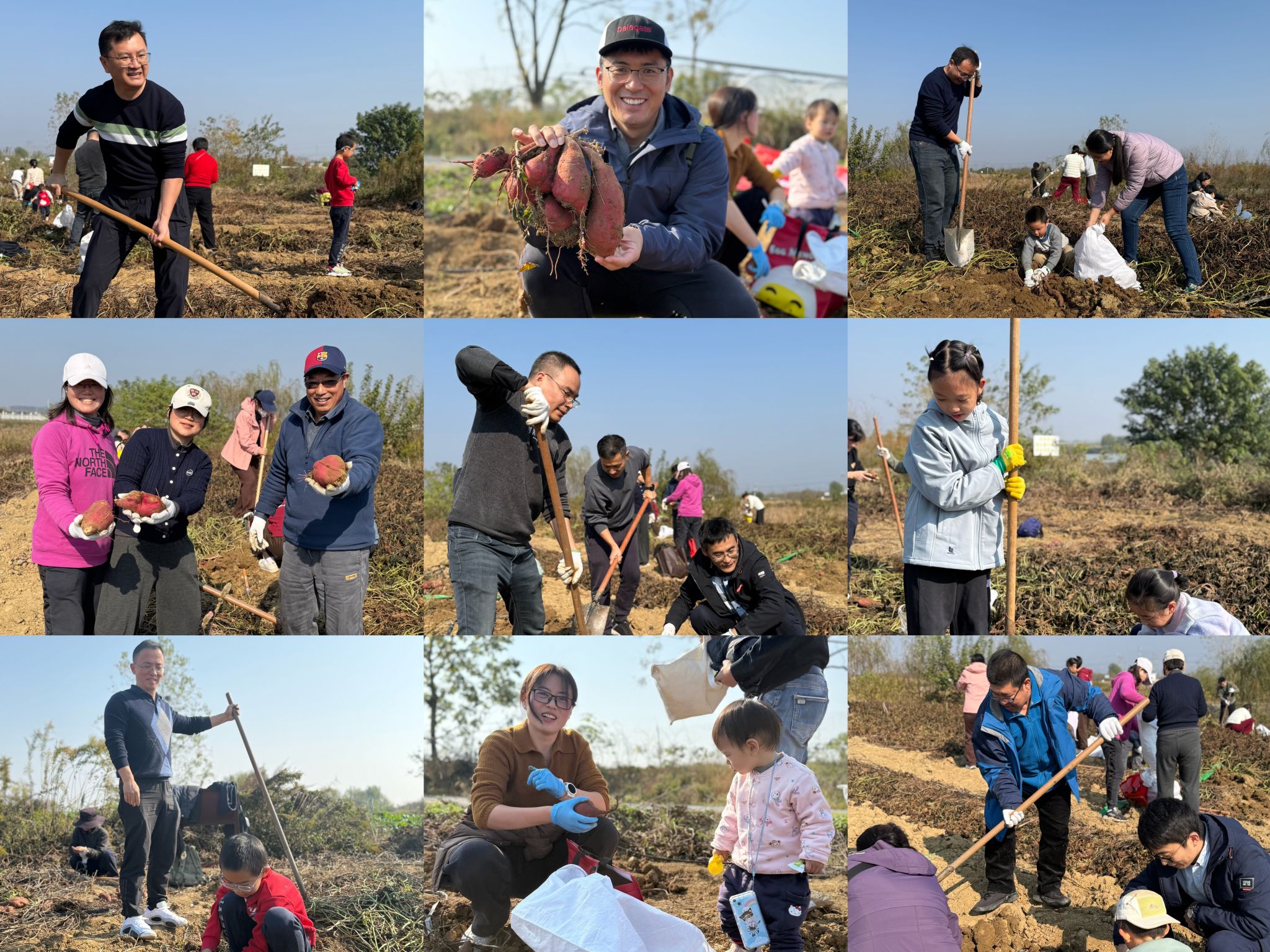 来到田间地头,小朋友和家长都非常兴奋,大家纷纷拿着耙子、铲子、镰刀等农具,寻找藏在地里的红薯,每一步都充满新奇与期待,通过一上午的亲子劳作,大家都在实践中感受劳动价值,收获满满硕果。