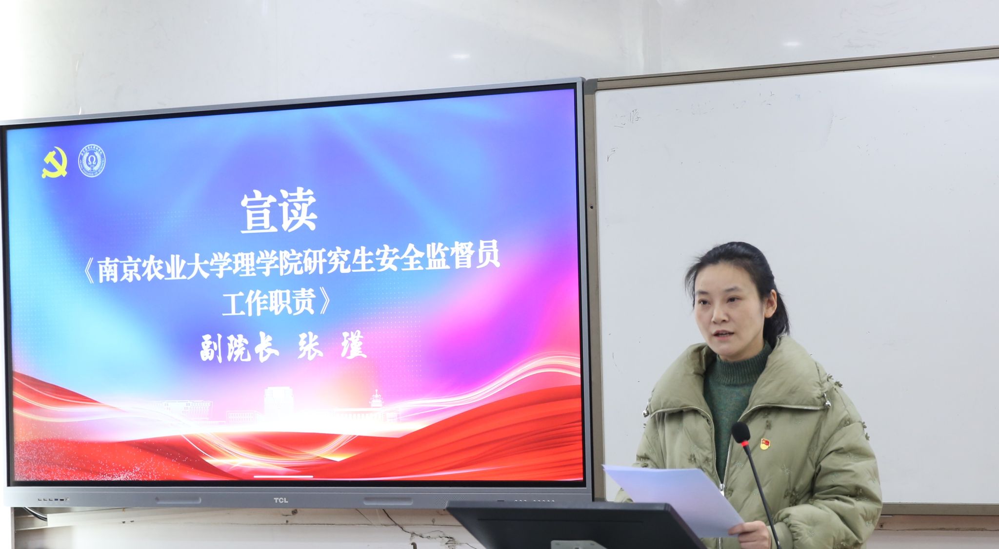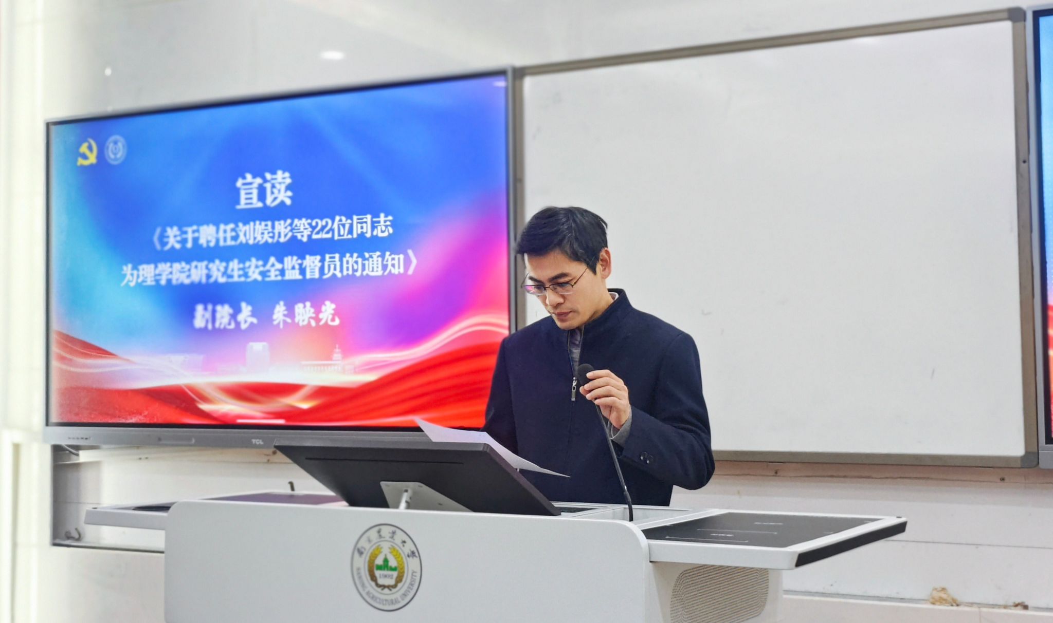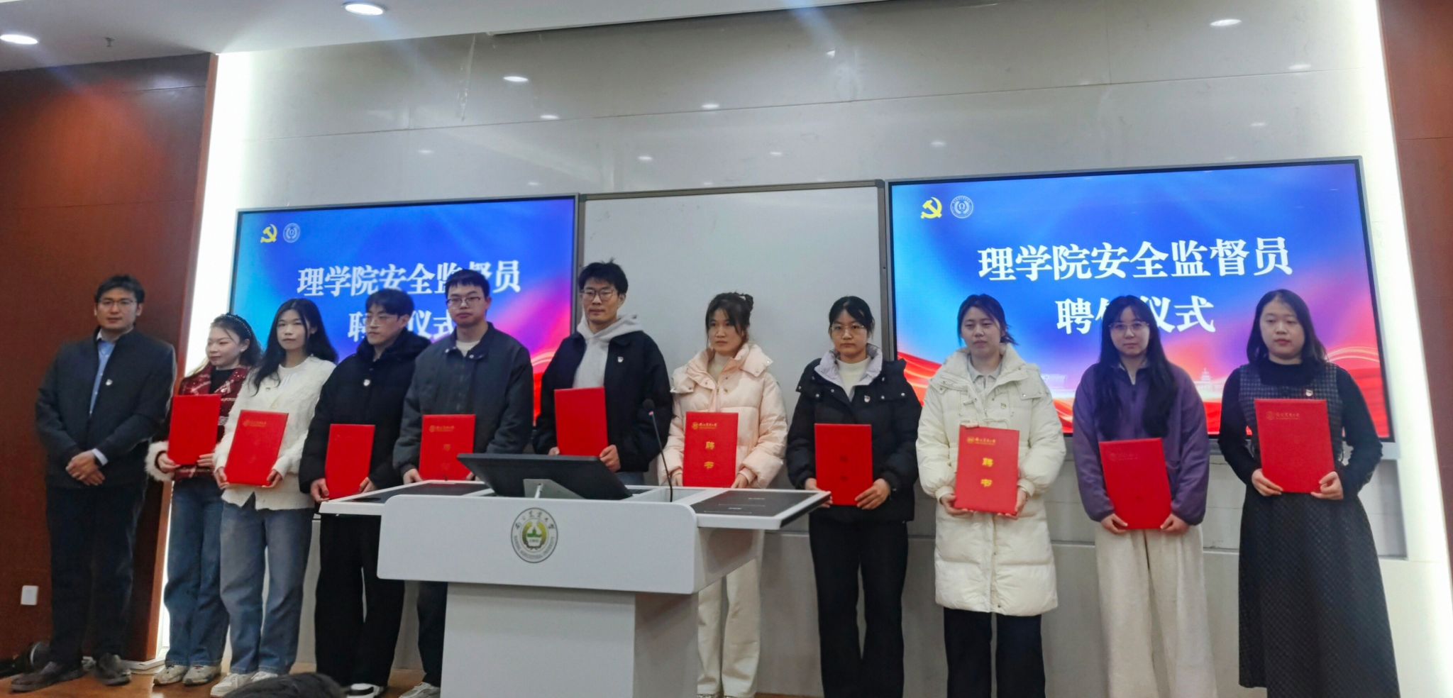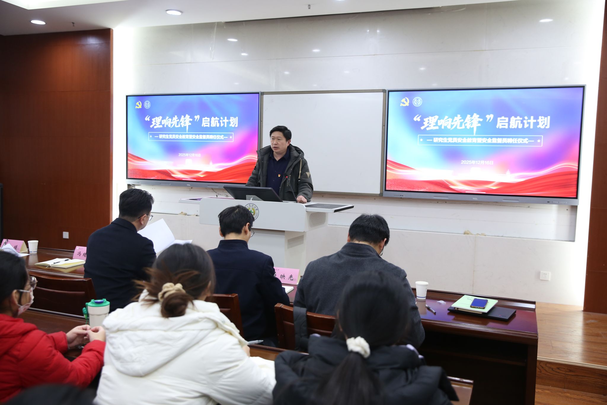 为深化党建引领作用,扎实筑牢校园安全屏障,充分发挥研究生党员在安全治理工作中的先锋模范作用,12 月 16 日下午,理学院 “理响先锋” 启航计划正式启动,研究生党员安全教育暨安全监督员聘任仪式同步顺利举行。院党委书记李日葵,党委副书记冯绪猛,副院长朱映光、张瑾、吴顺凡出席活动,研究生党支部书记、院兼职研究生辅导员及全体研究生党员共同参与。本次聘任仪式由冯绪猛主持。