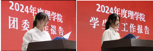 理学院学生兼任团委副书记解韫菡同学和执行主席白广慧同学分别作2024年度理学院团委、学生会工作报告,认真回顾总结了过去一年理学院团委、学生会工作开展情况、取得的成绩和进步。
