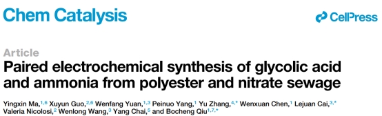 近日,我校邱博诚教授团队在Cell Press出版社期刊Chem Catalysis上发表题为: “Paired electrochemical synthesis of glycolic acid and ammonia from polyester and nitrate sewage”的论文,以废弃的对苯二甲酸乙二醇酯(polyethylene terephthalate, PET)塑料和硝酸盐(NO₃⁻)废水为原料,实现了在温和条件下高效同产高值化学品—乙醇酸与氨。